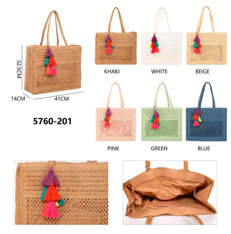 Amplio Bolso de Papel para Mujer con Pompones Decorativos Multicolores y 2 Asas.