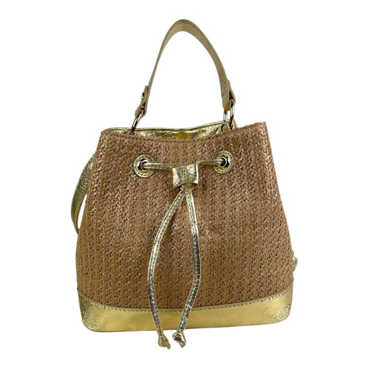 Bolso de Mano Sintético tipo Bucket con Efecto Brillante, Cierre de Cuerdas y Cremallera Mujer