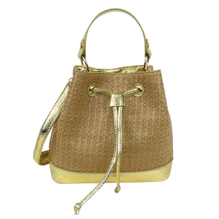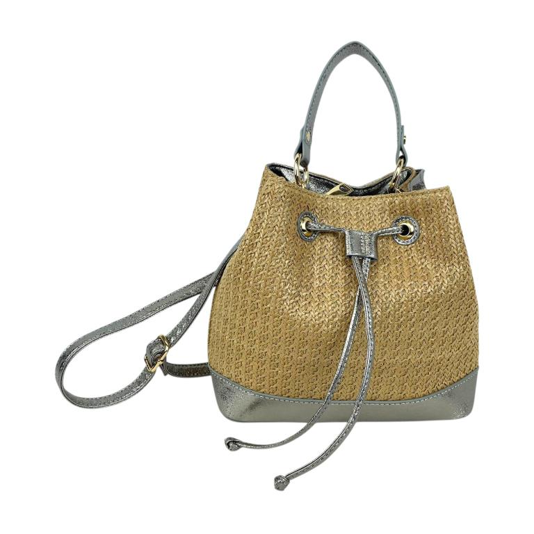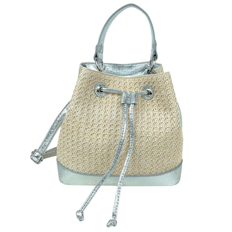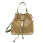 Bolso de Mano Sintético tipo Bucket con Efecto Brillante, Cierre de Cuerdas y Cremallera para Mujer.