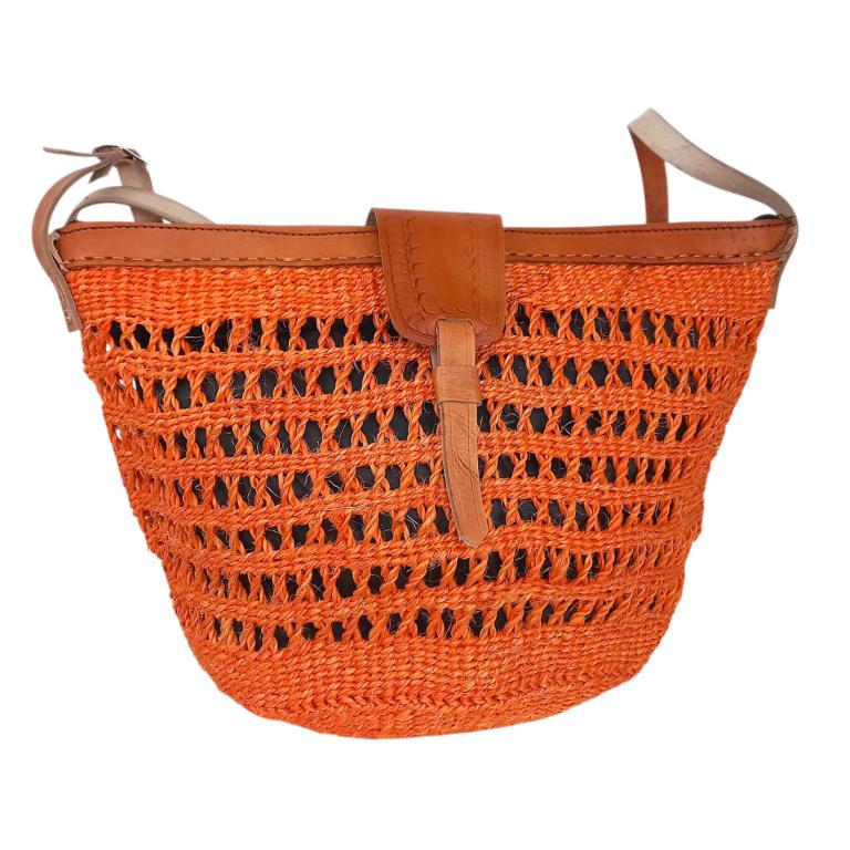 Capazo Artesanal Africano de Lino y Yerba Autóctona con Diseño Exclusivo de Rejilla, Asa Larga y Solapa