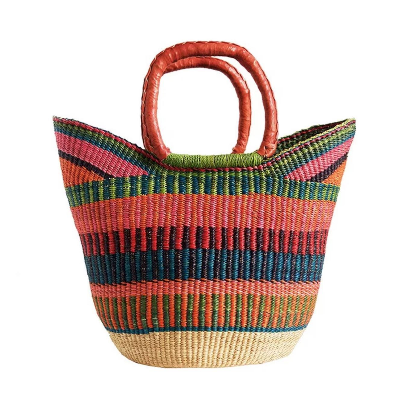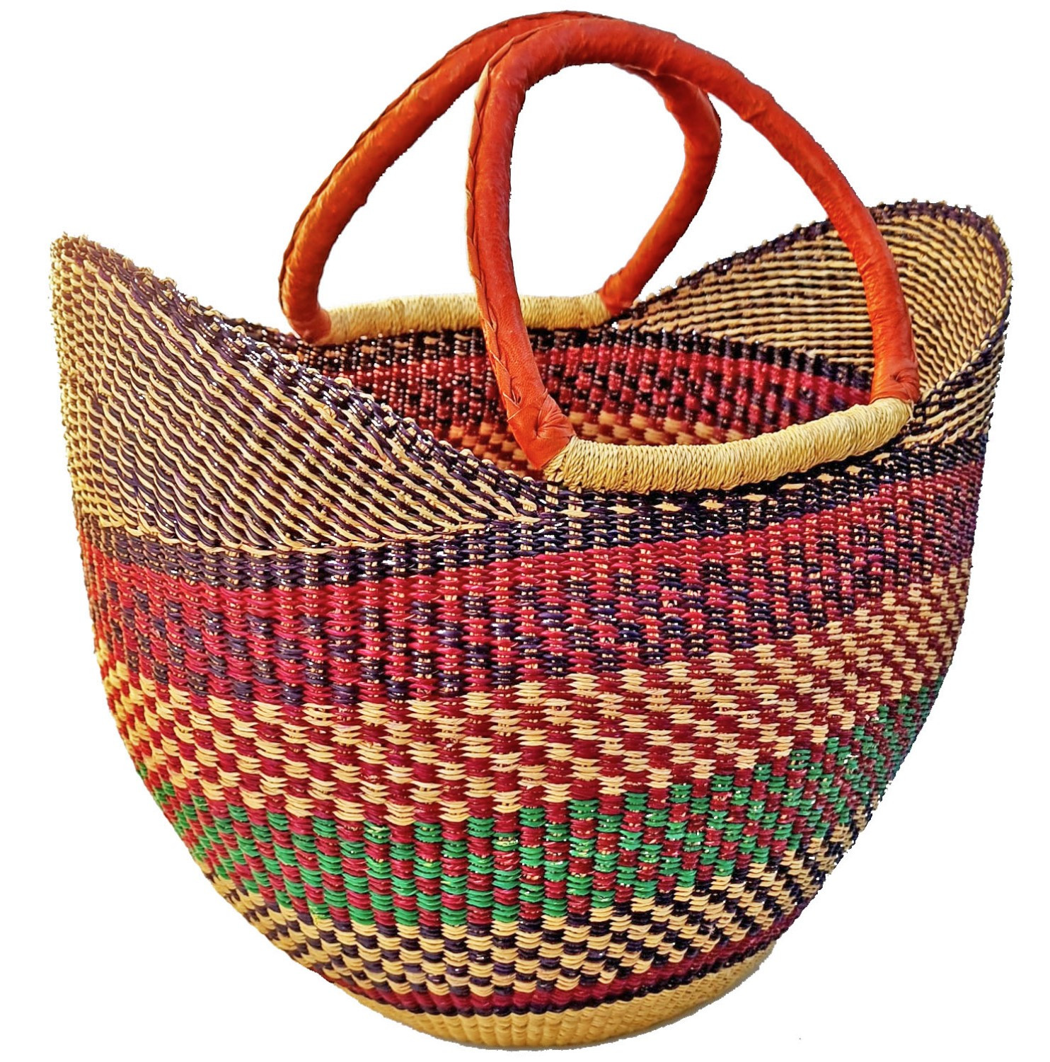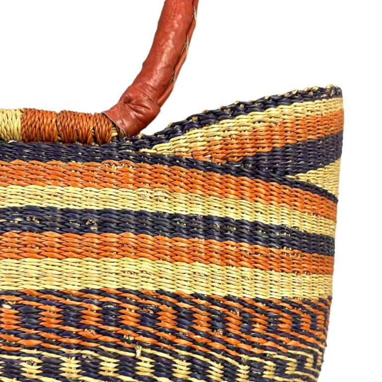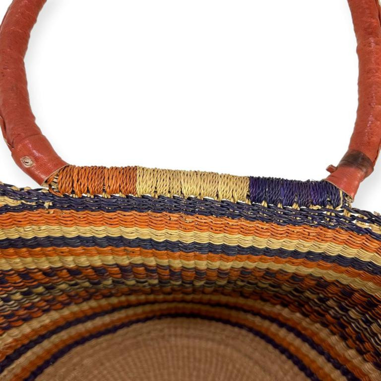 Capazo artesanal GRANDE africana de Ghana, ligero, moldeable, único y sostenible. Las asas con terminación piel para un mayor resistencia al uso. El teñido es natural, fabricado por los artesanos en Ghana.