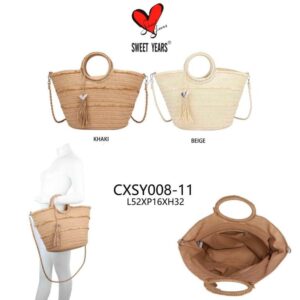 Amplia Cesta de Rafia con Flecos Decorativos Frontales, 2 Asas Circulares y Tira Bandolera para Mujer