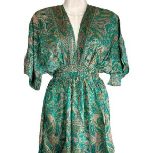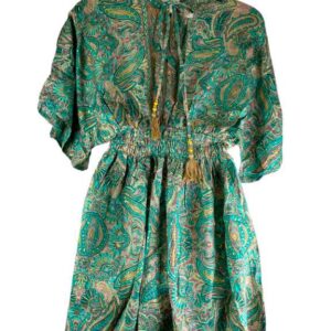 Vestido Corto Artesanal de Mujer en Seda India con Escote y Nudo con Cuerdas en la Espalda