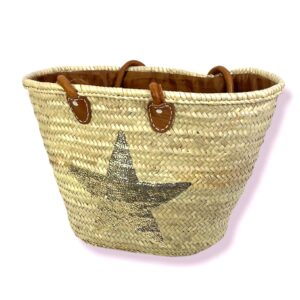 Amplia Cesta de Paja Artesanal con Asas de Piel y Diseño de Estrella para Mujer
