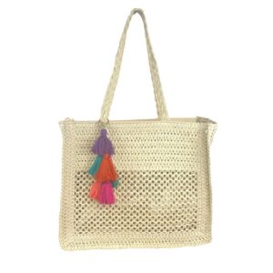 Amplio Bolso de Papel para Mujer con Pompones Decorativos Multicolores y 2 Asas