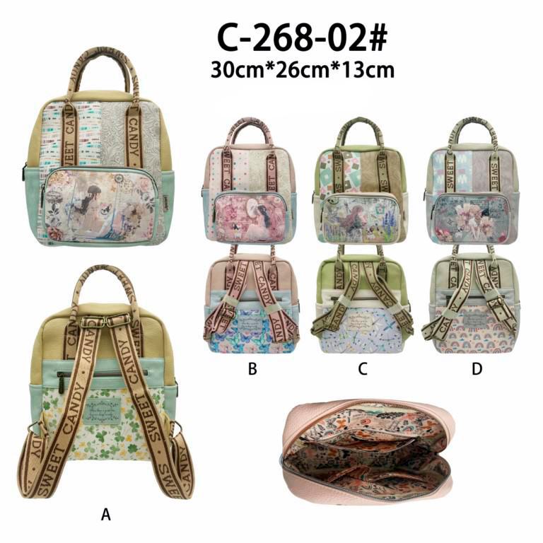 Amplia Mochila de Mujer con Diseño Muñeca Sweet Candy, Bolsillos Exteriores, 2 Asas Cortas y 2 Correas Ajustables en la Zona de la Espalda.