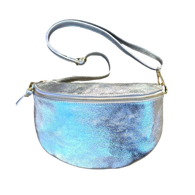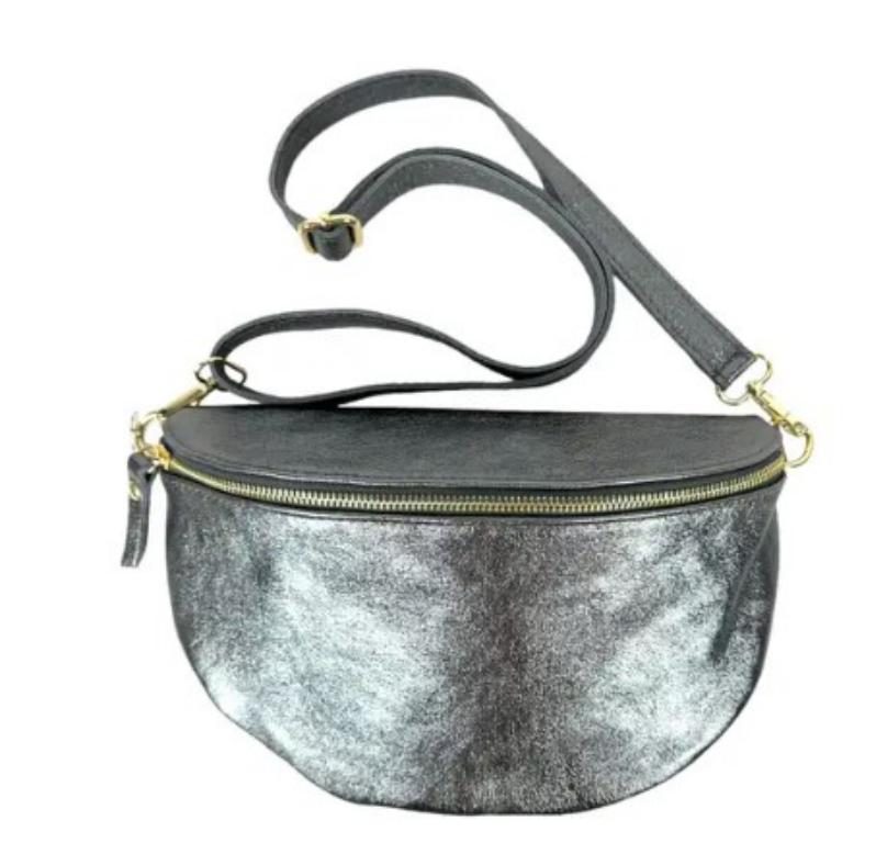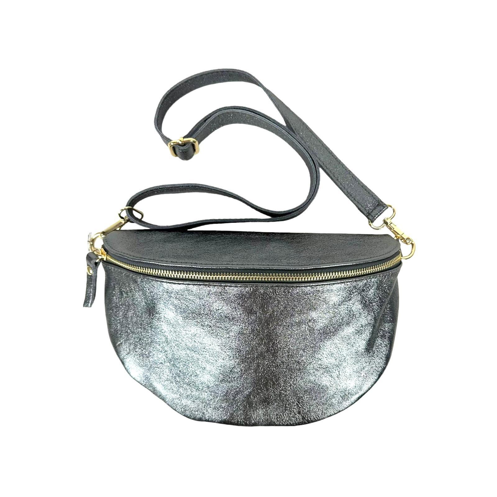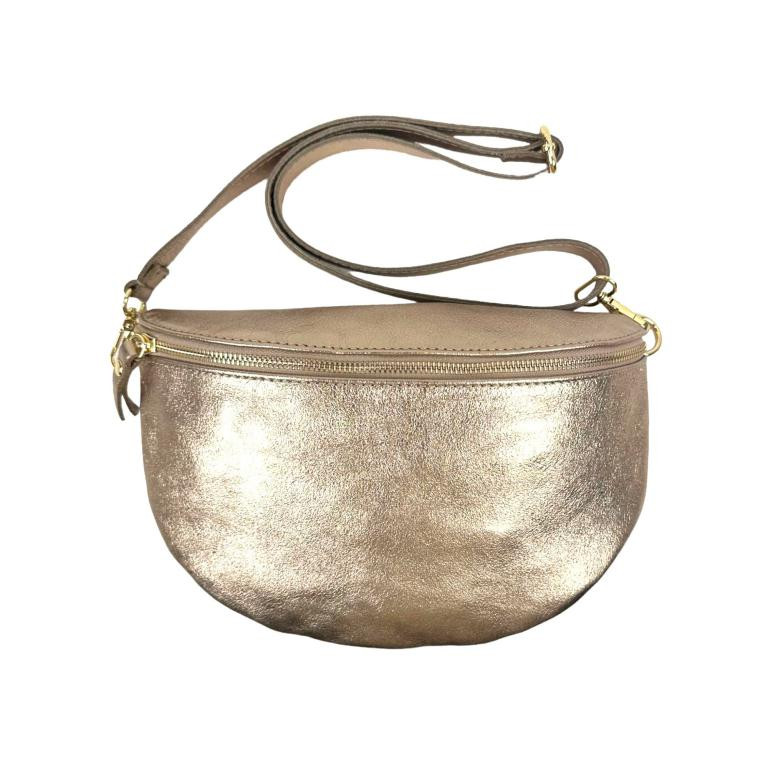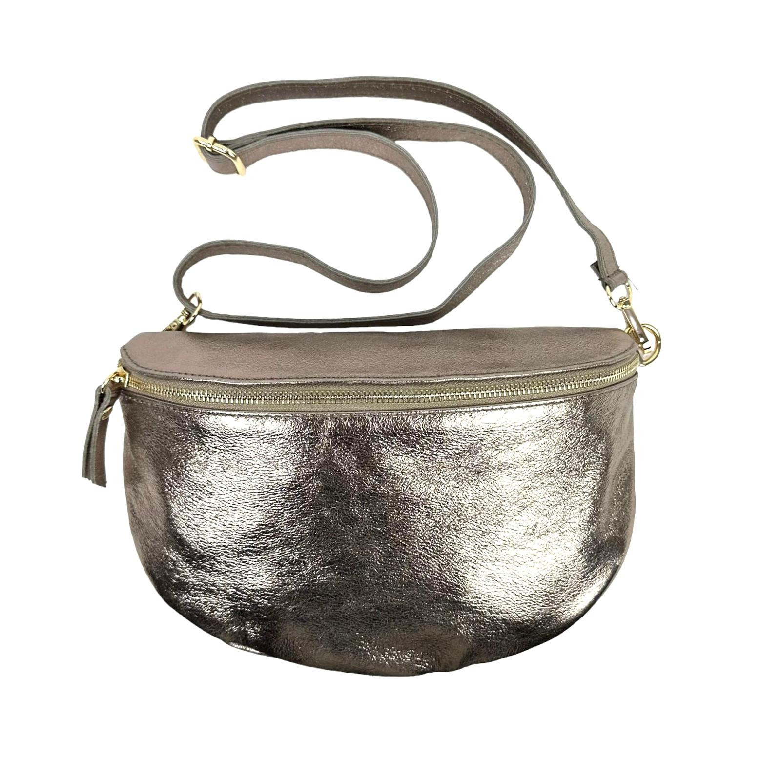 Amplia Riñonera Metalizada de Piel Italiana para Mujer con Efecto Brillante.