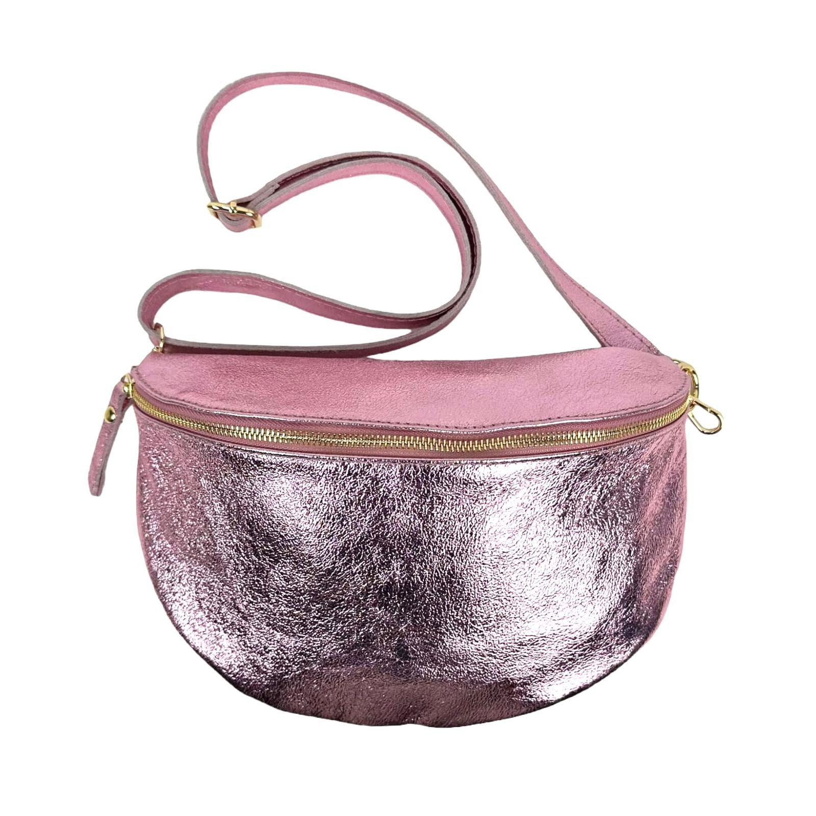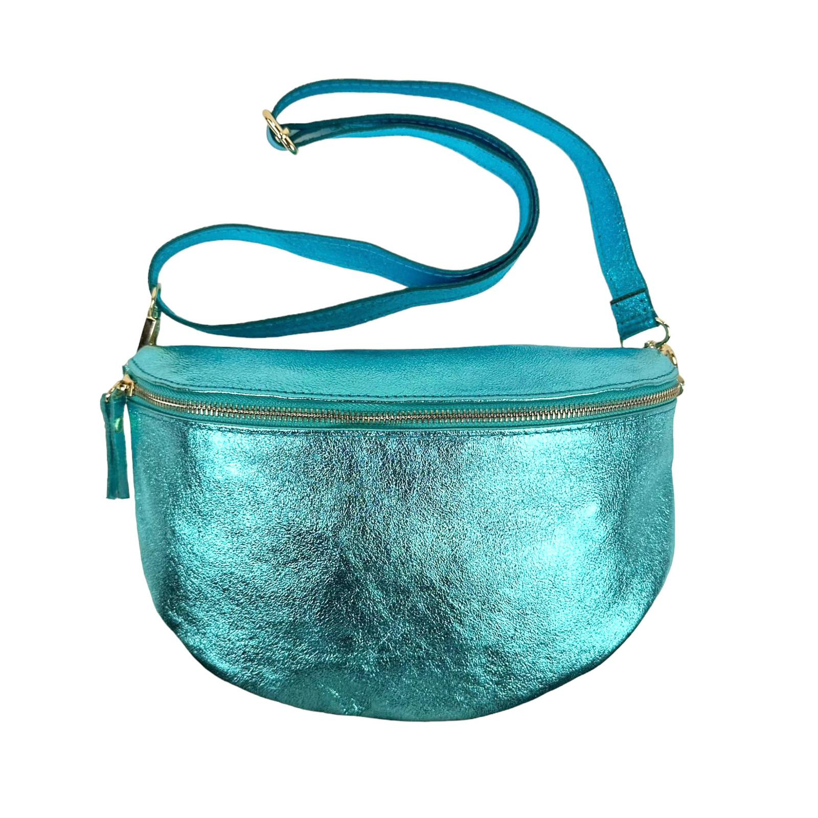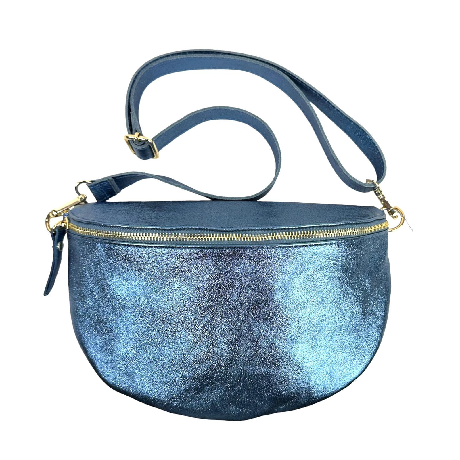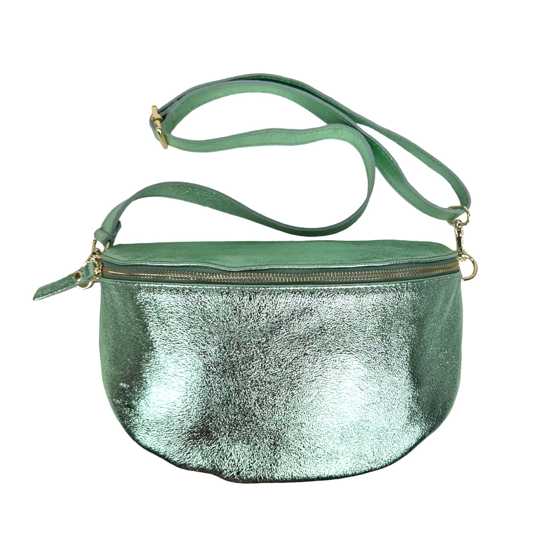 Amplia Riñonera Metalizada de Piel Italiana para Mujer con Efecto Brillante.