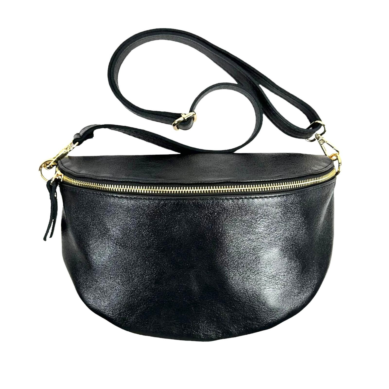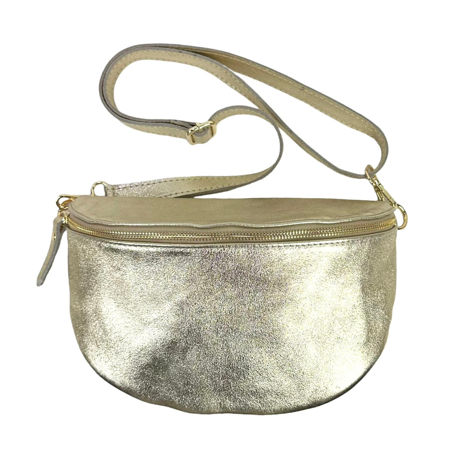 Amplia Riñonera Metalizada de Piel Italiana para Mujer con Efecto Brillante