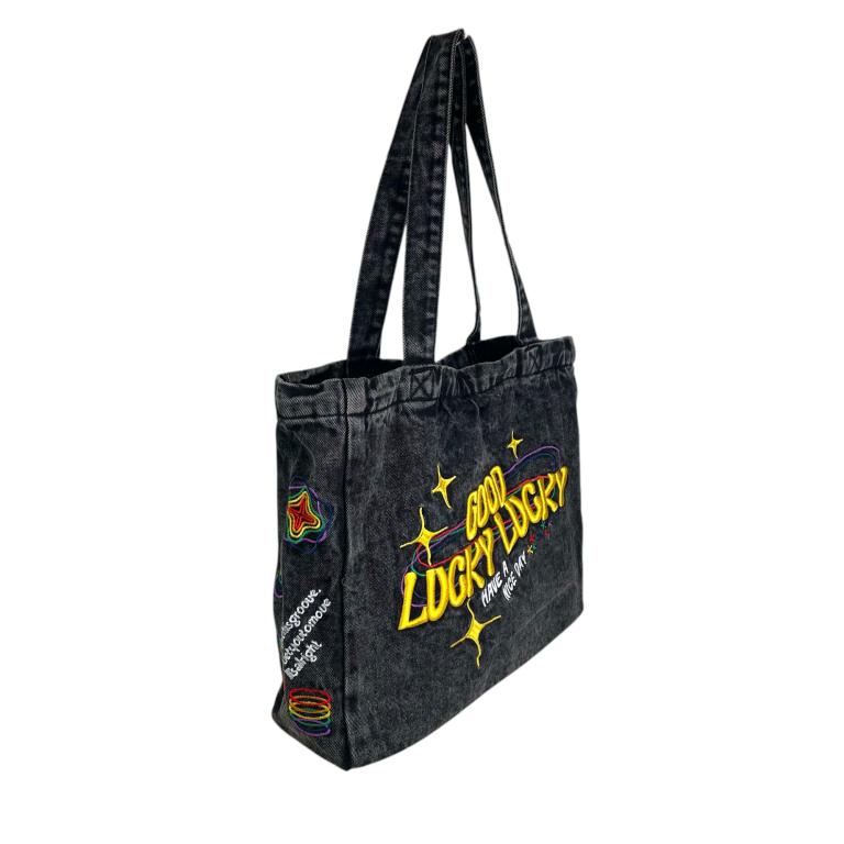 Amplio Bolso de Hombro en Algodón y Tela Vaquera con 2 Asas Largas y Diseño “Good Lucky Lucky” para Mujer