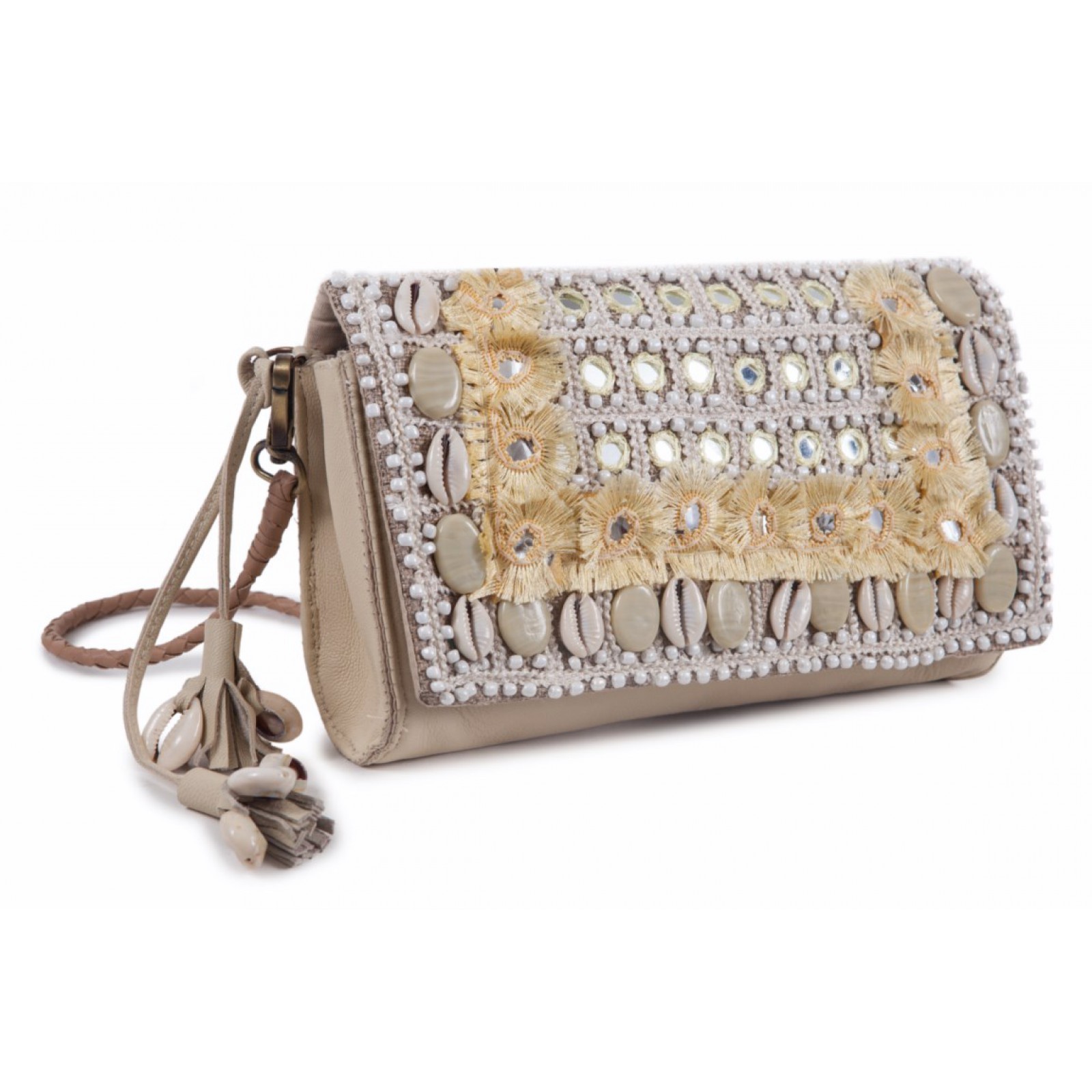 Bandolera con solapa decorado con conchas, hecha a mano.