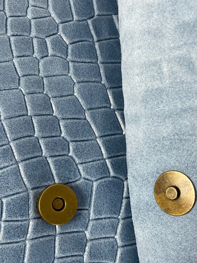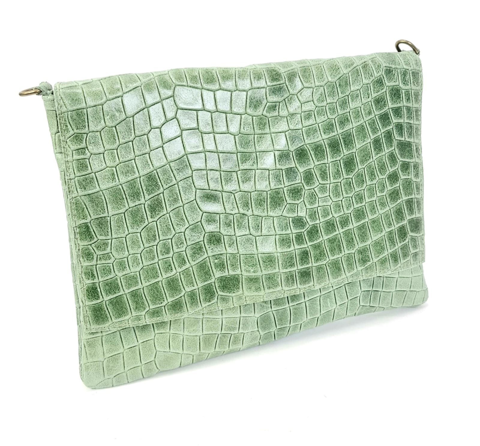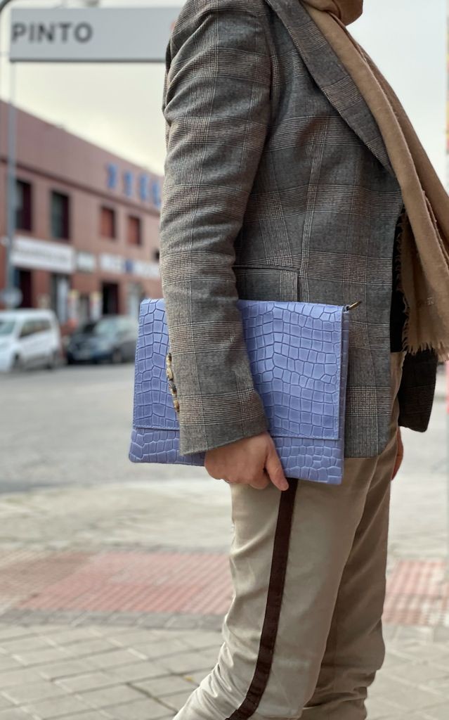 El diseño incluye estampado de piel de cocodrilo, parte superior tipo solapa y cierre doble magnético y cremallera.