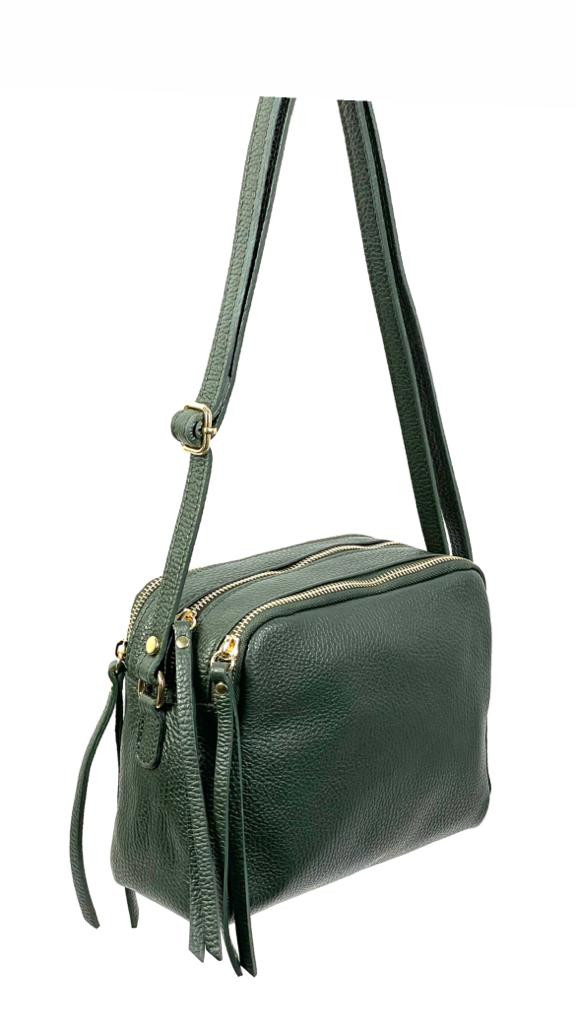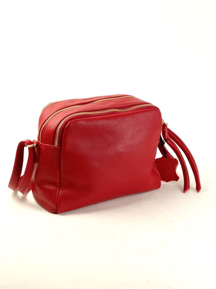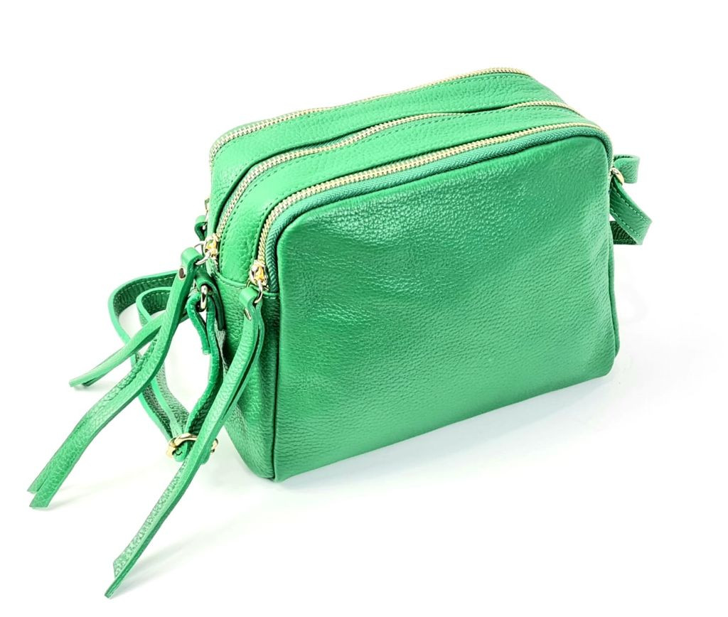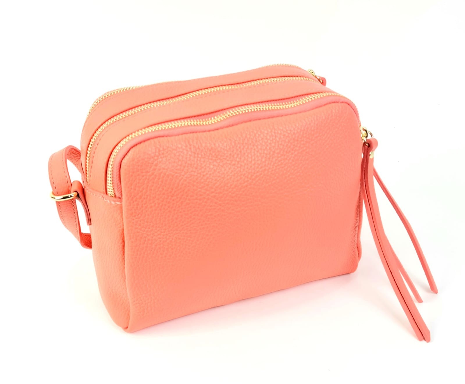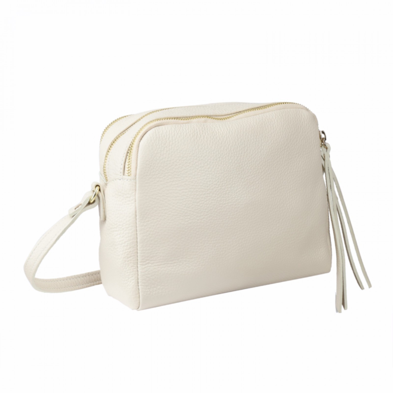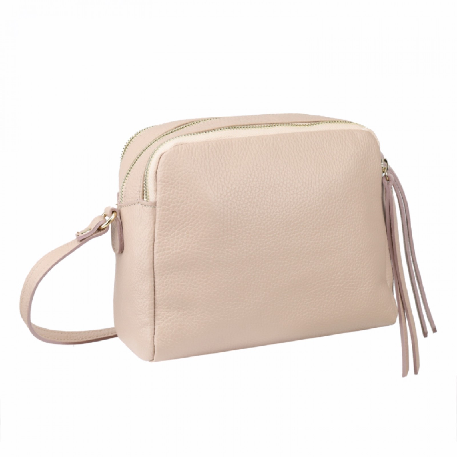 El diseño incluye tres departamentos con cierre de cremallera y adornos de flecos en los extremos de las cremalleras.
