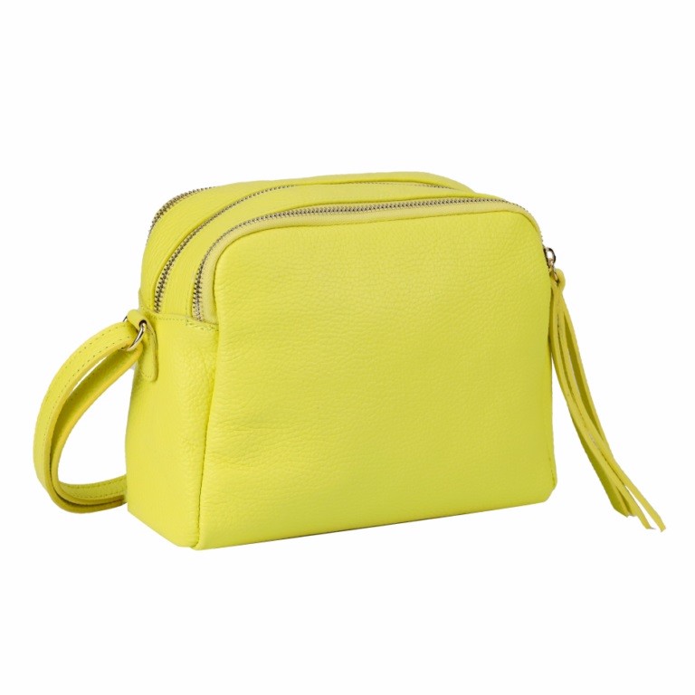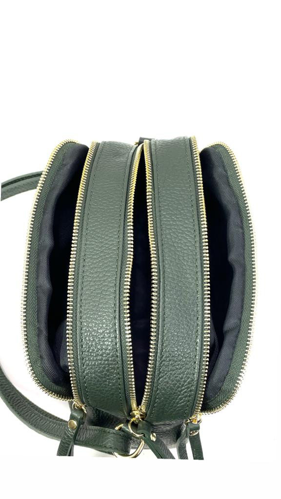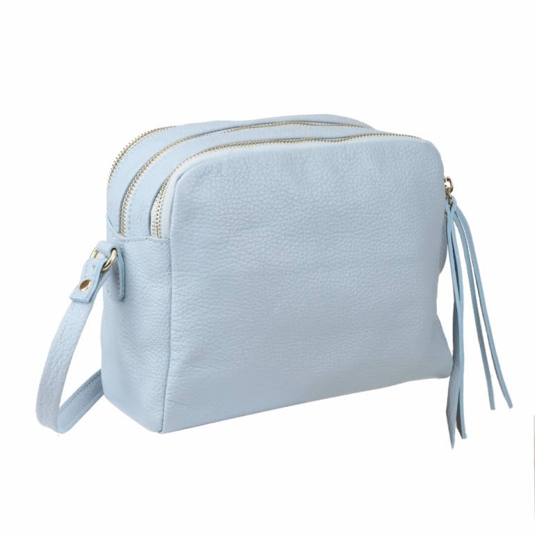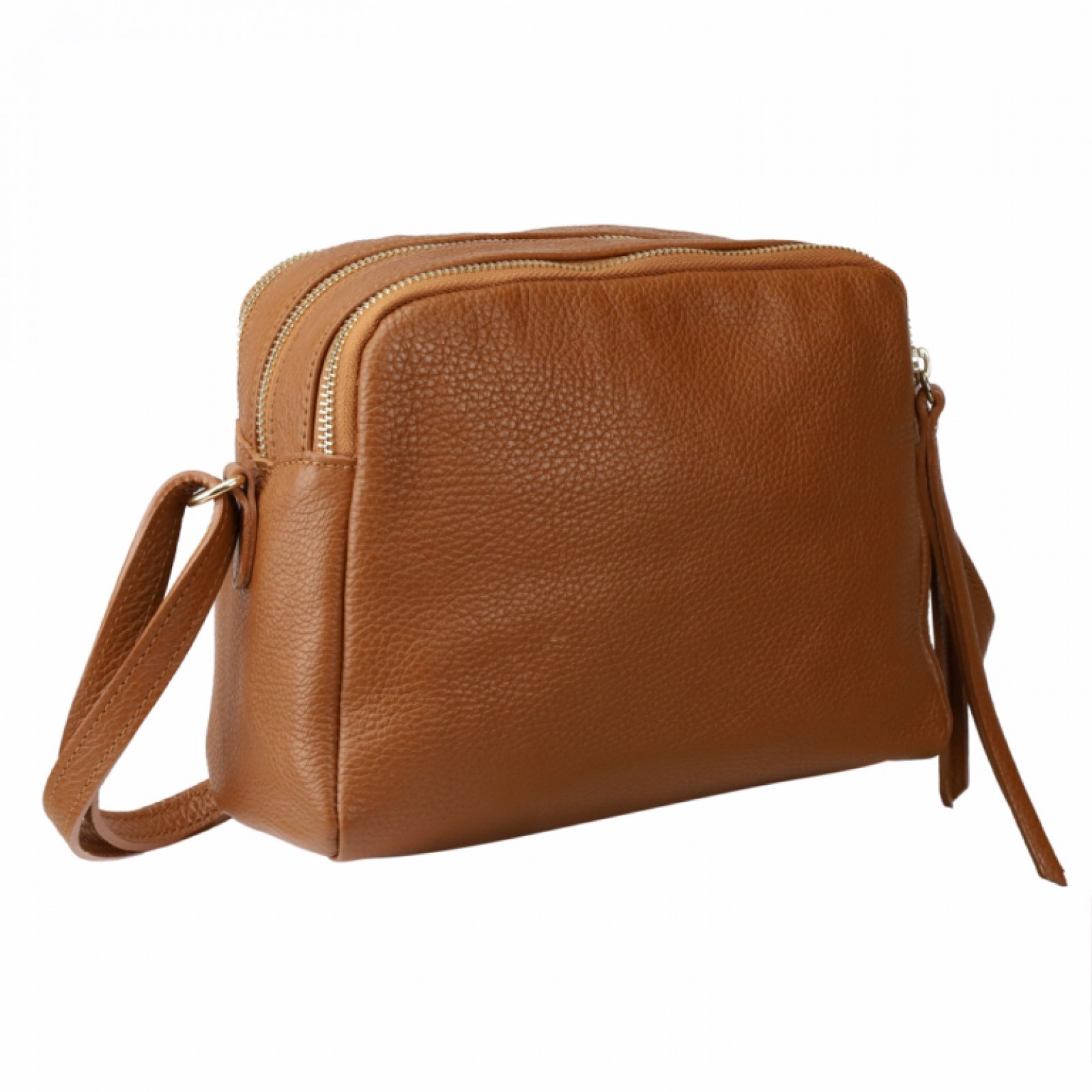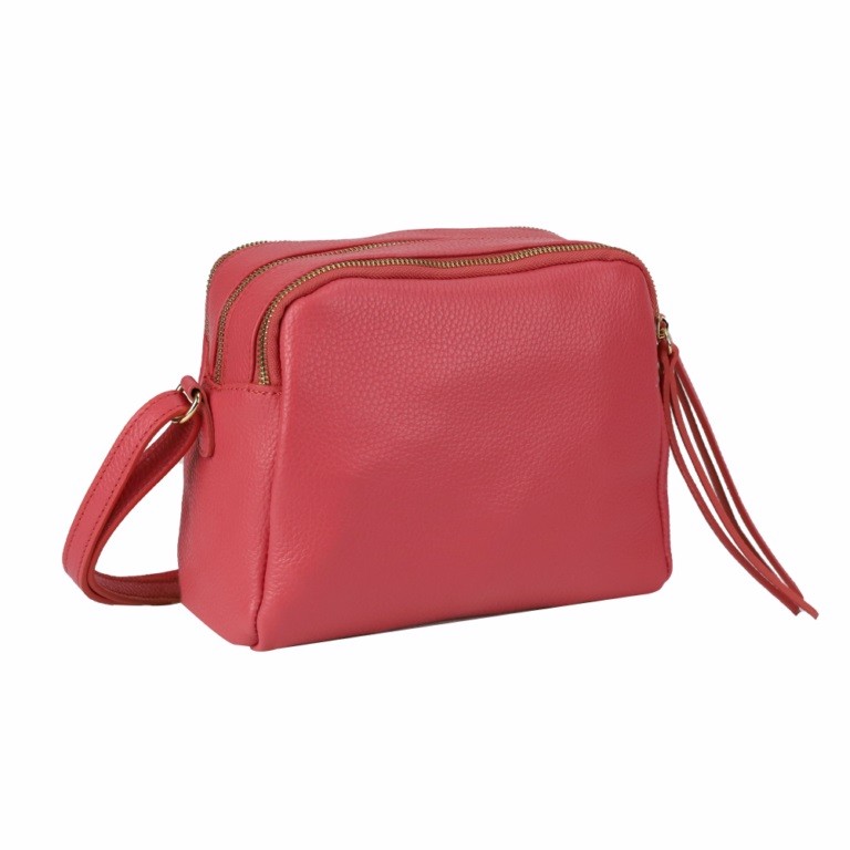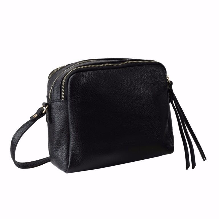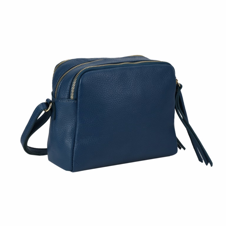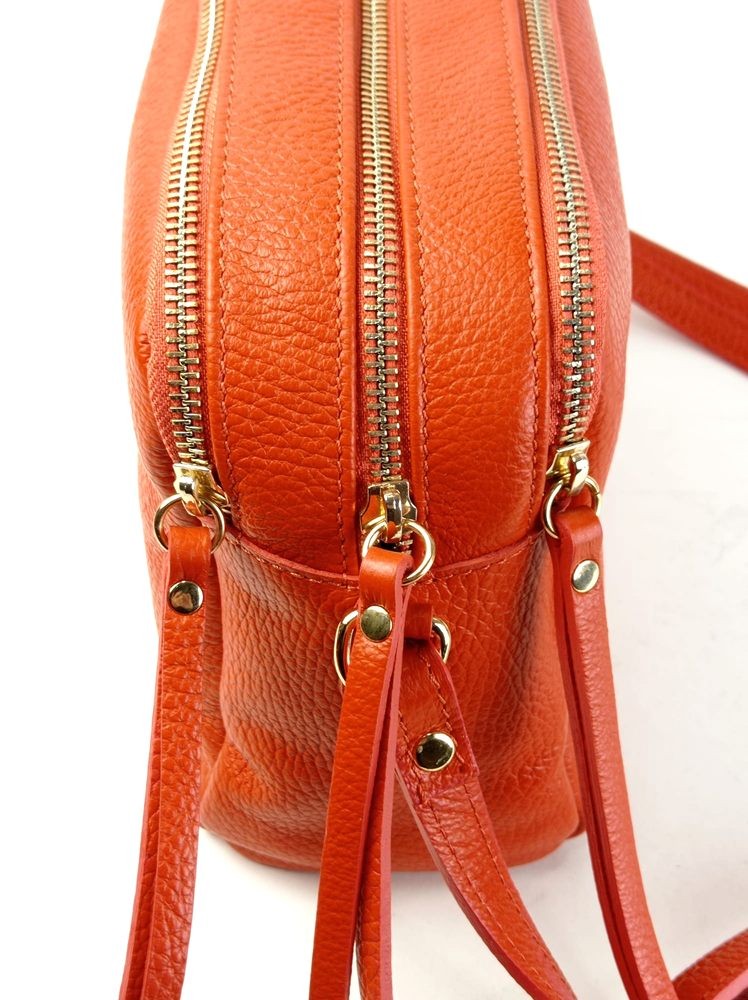 El diseño incluye tres departamentos con cierre de cremallera y adornos de flecos en los extremos de las cremalleras.