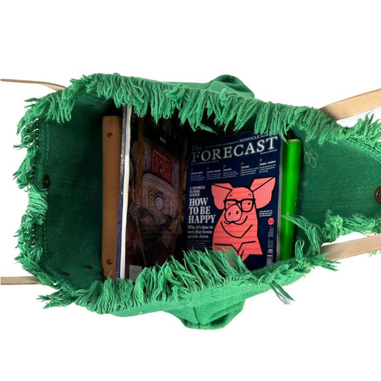 Material: algodón. Las asas son de Piel autentica.