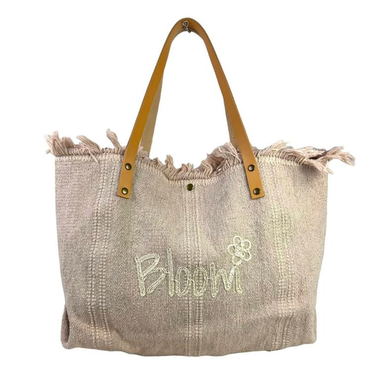 Bolso Shopper de algodón con Asas Largas de Piel para Mujer. Viene cosido con la palabra “Bloom” en ingles que significa florecer. Es muy ligero y mucha capacidad.