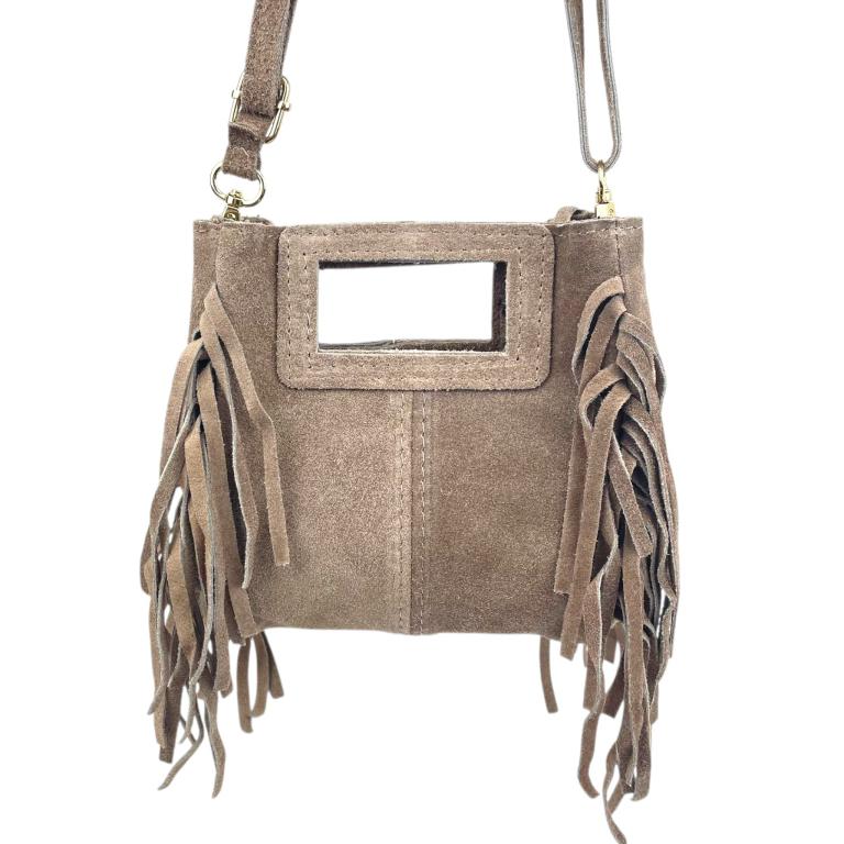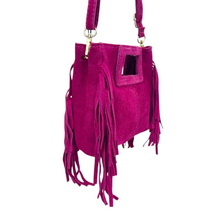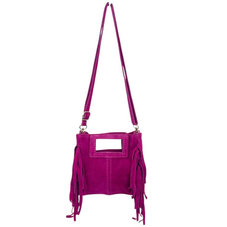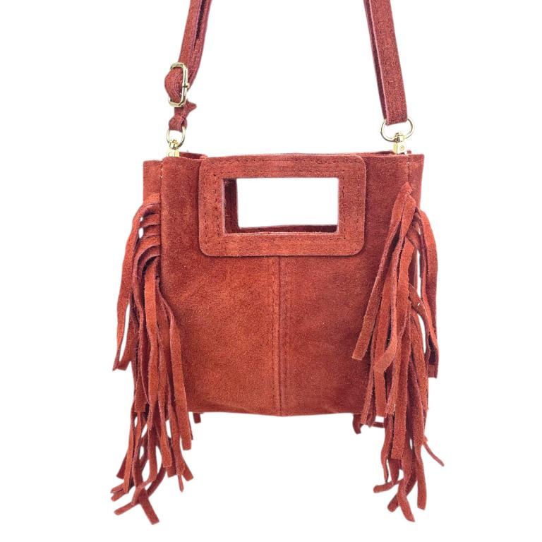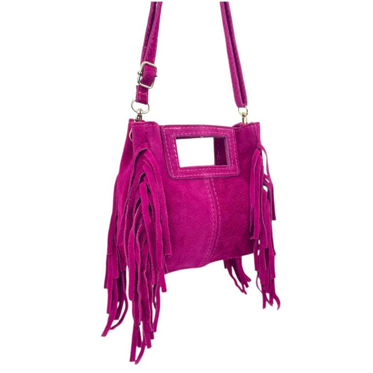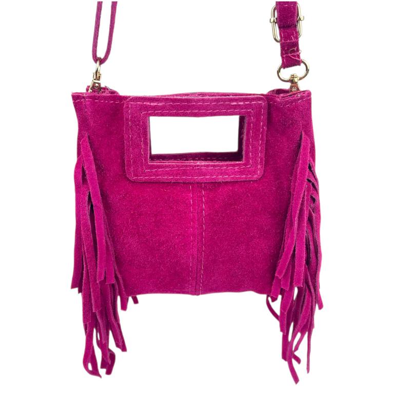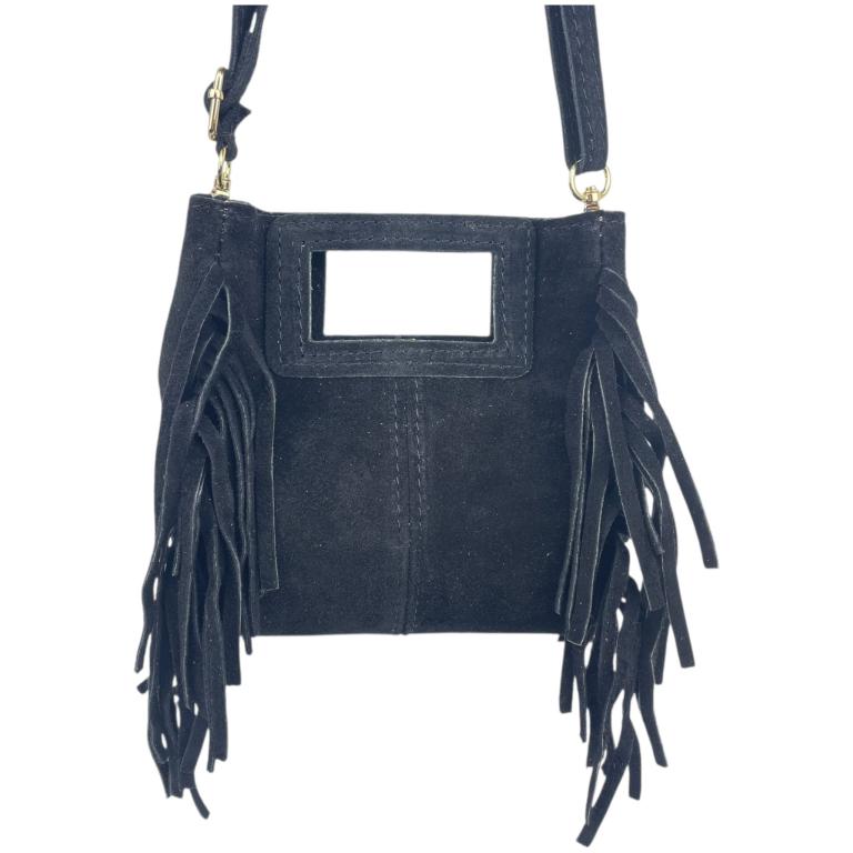 Bolsito de Mano Compacto en Piel de Serraje Italiana con Flecos Laterales para Mujer