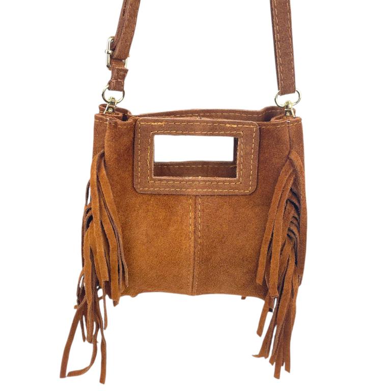 Sé el primero en valorar “Bolsito de Mano Compacto en Piel de Serraje Italiana con Flecos Laterales para Mujer”
