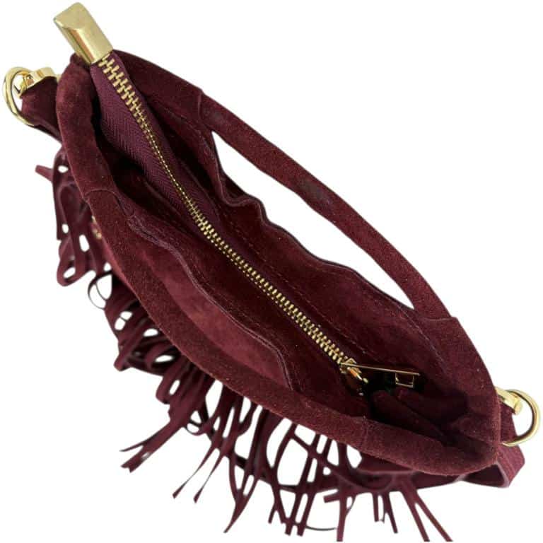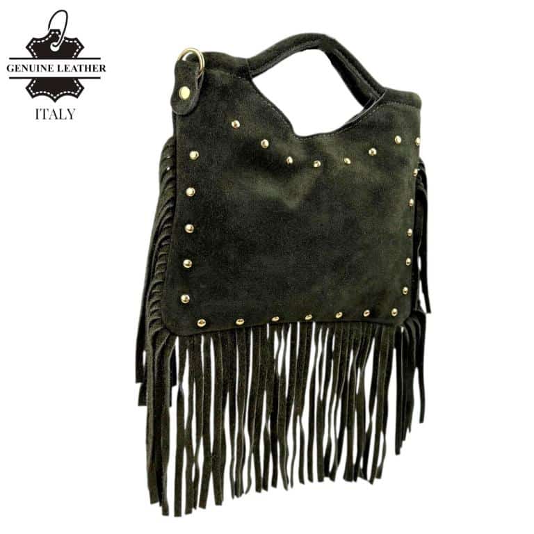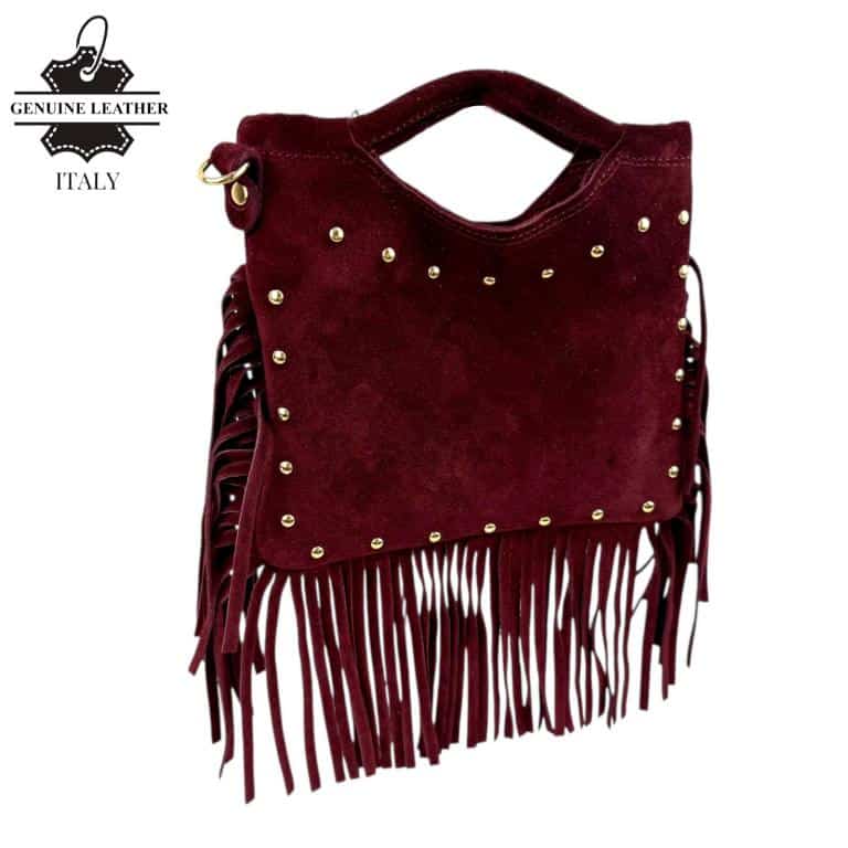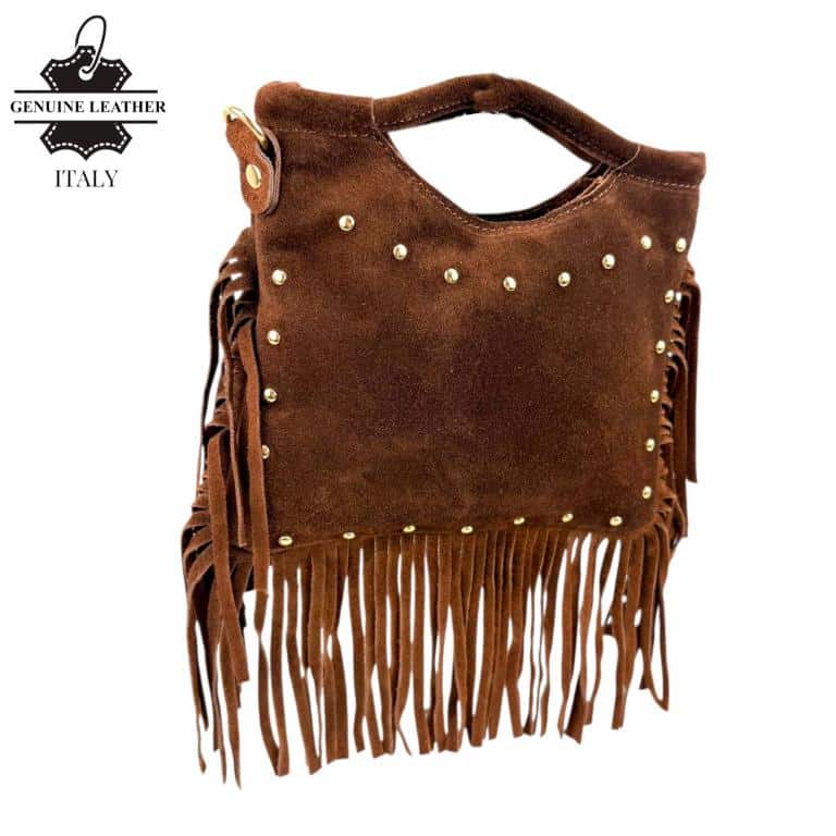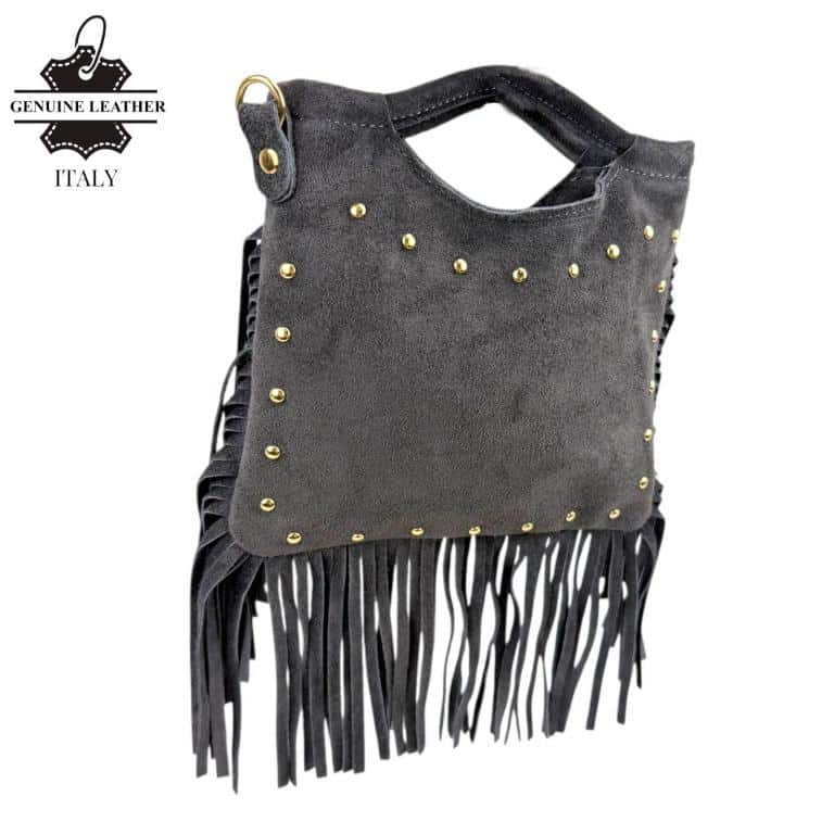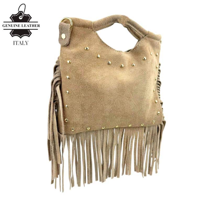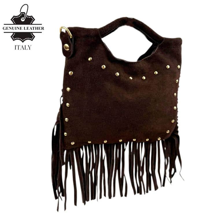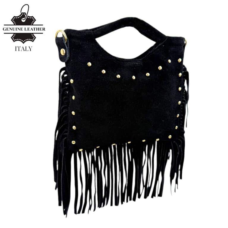 Bolsito de Mano Compacto en Piel de Serraje con Tachuelas Frontales y Flecos Decorativos para Mujer. Fabricado en Italia.