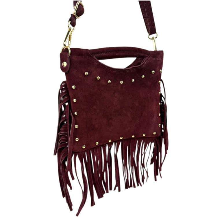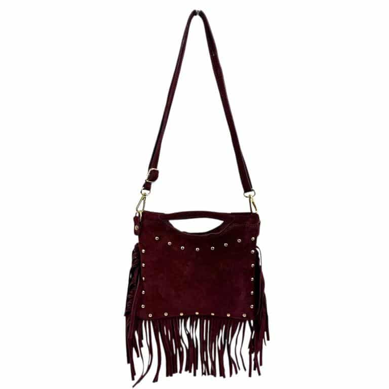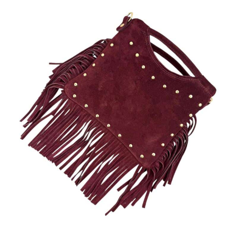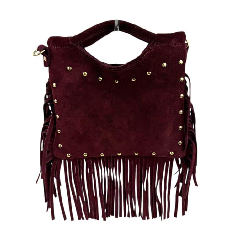 Bolsito de Mano Compacto en Piel de Serraje con Tachuelas Frontales y Flecos Decorativos para Mujer.