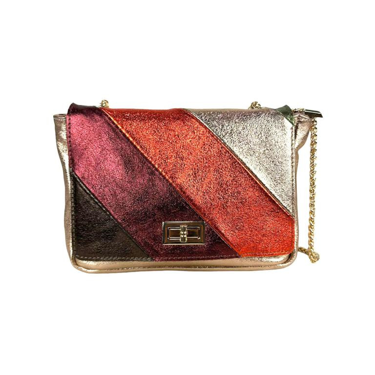 Bolso Bandolera Multicolor de Piel Italiana con Efecto Brillante y 2 Asas Ajustables tipo Cadena Dorada para Mujer. Fabricado en Italia.
