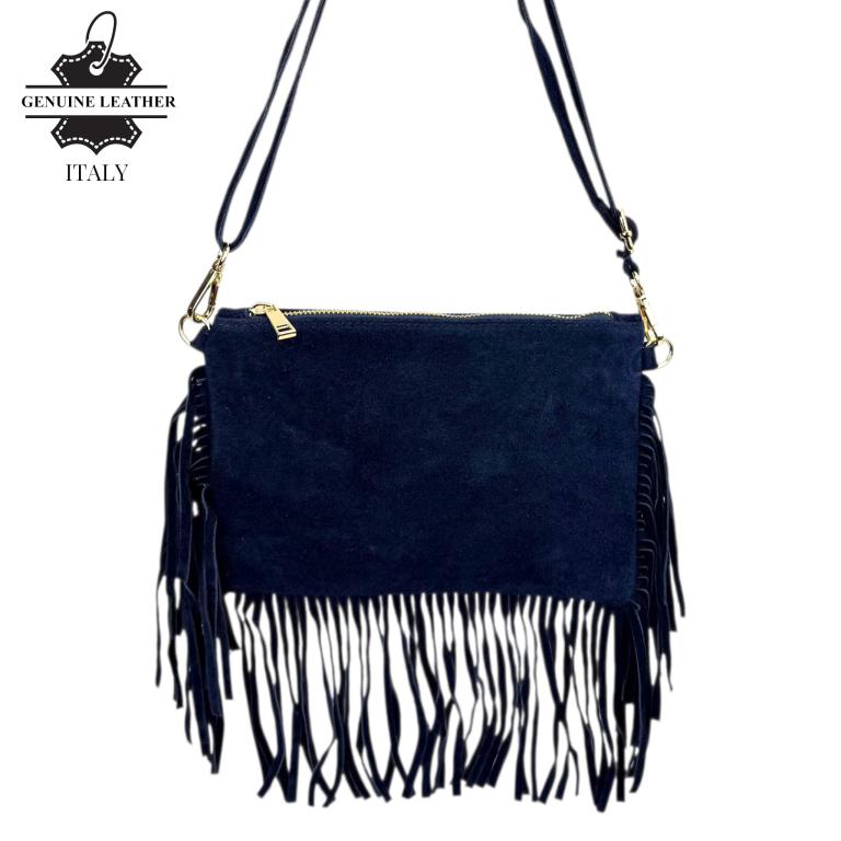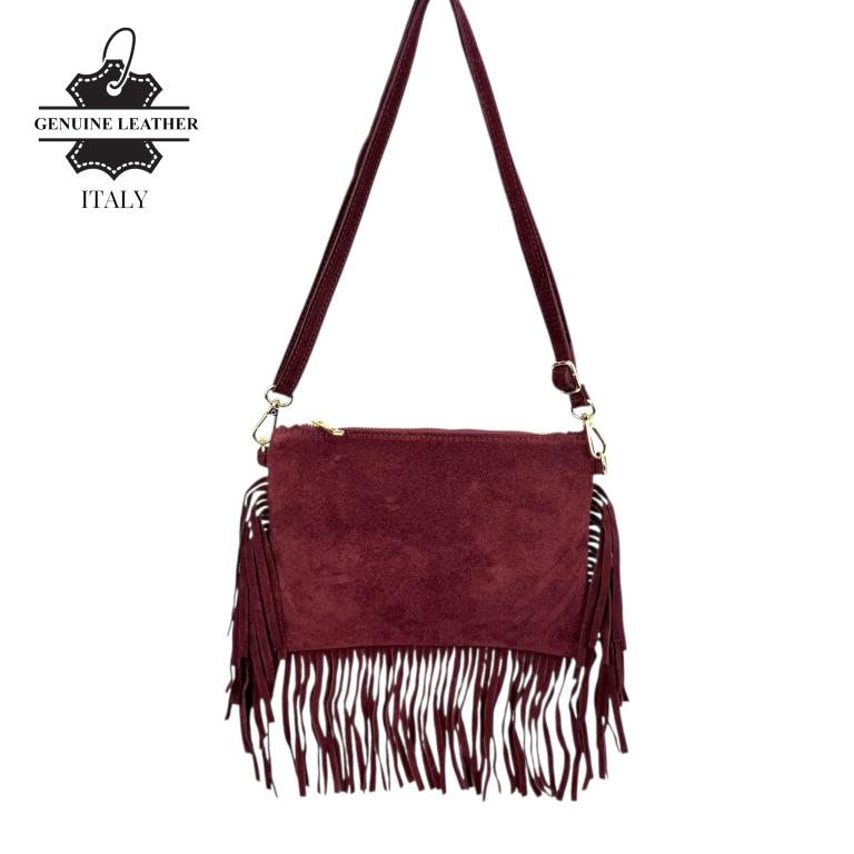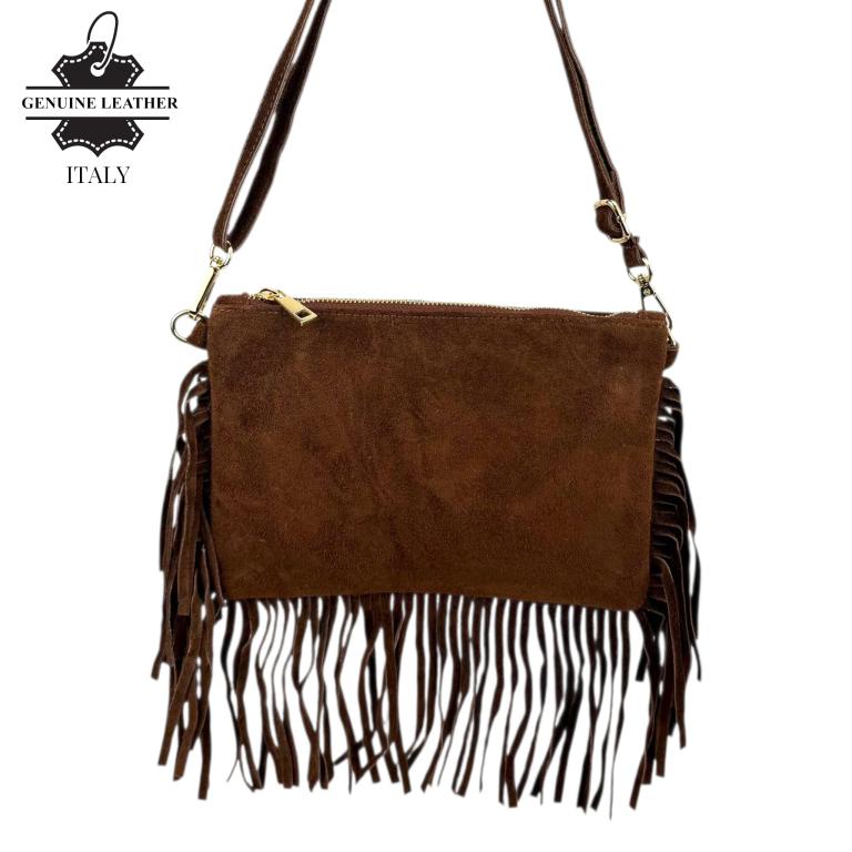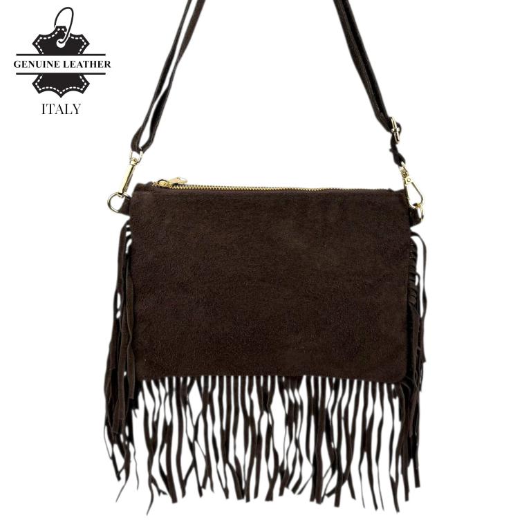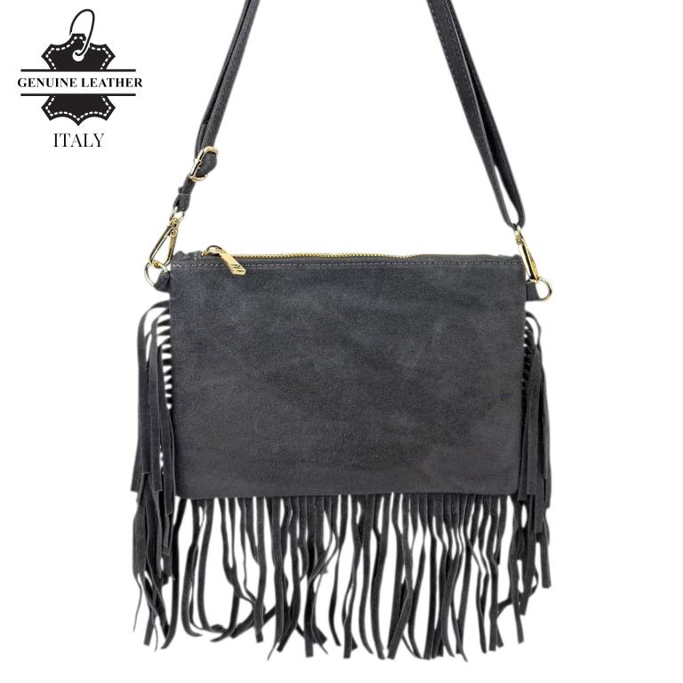 Bolso Bandolera en Piel de Serraje con Flecos Decorativos y Cierre de Cremallera para Mujer. Fabricado en Italia.