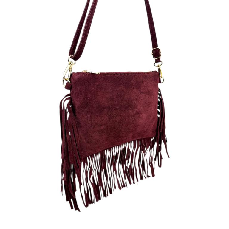 Bolso Bandolera en Piel de Serraje Italiano con Flecos Decorativos y Cremallera para Mujer