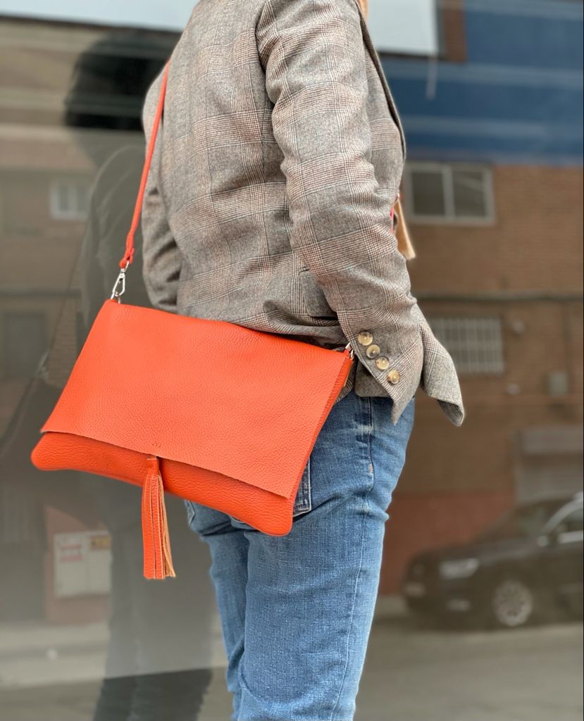 Bolso bandolera de piel con solapa y borla decorativa de piel