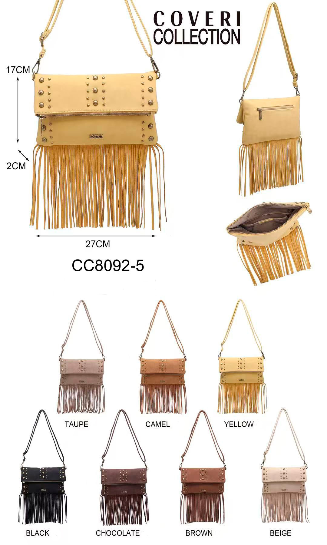 Bolso Bandolera Sintético con Flecos Decorativos, Piedras Frontales y Bolsillo Trasero con Cierre de Cremallera para Mujer. Colección Coveri Collection.