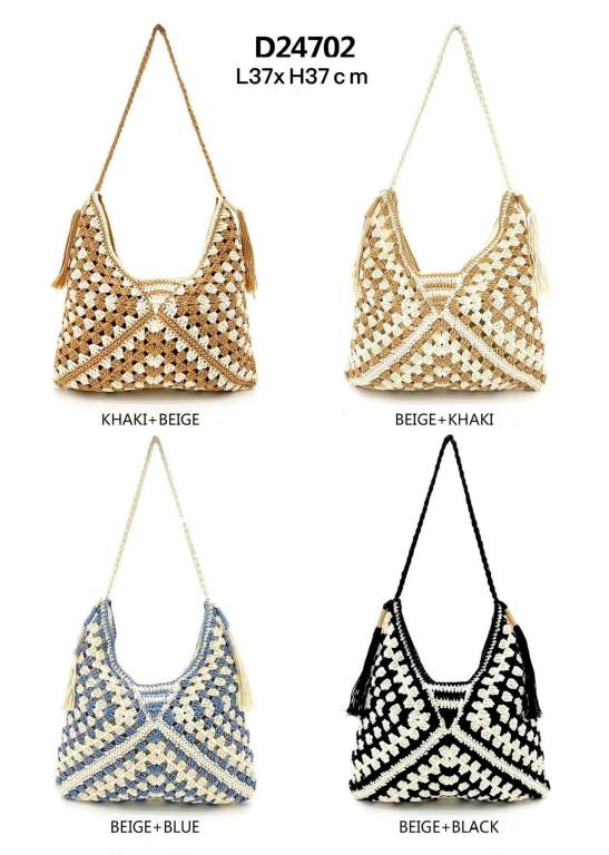 Bolso de Hombro de Algodón y Ganchillo para Mujer con Asa Larga y Cierre de Cremallera.