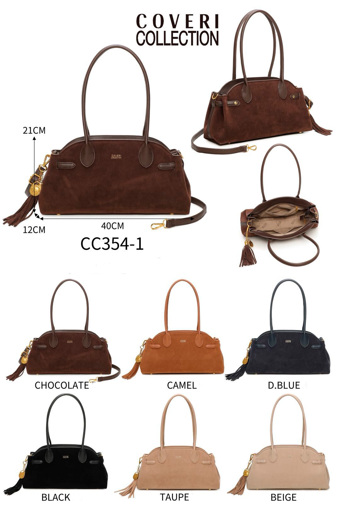 Bolso de Hombro Sintético tipo Bowling Estilo Serraje con 2 Asas Largas y 1 Tira Bandolera Ajustable y Extraíble para Mujer. Colección Coveri Collection.