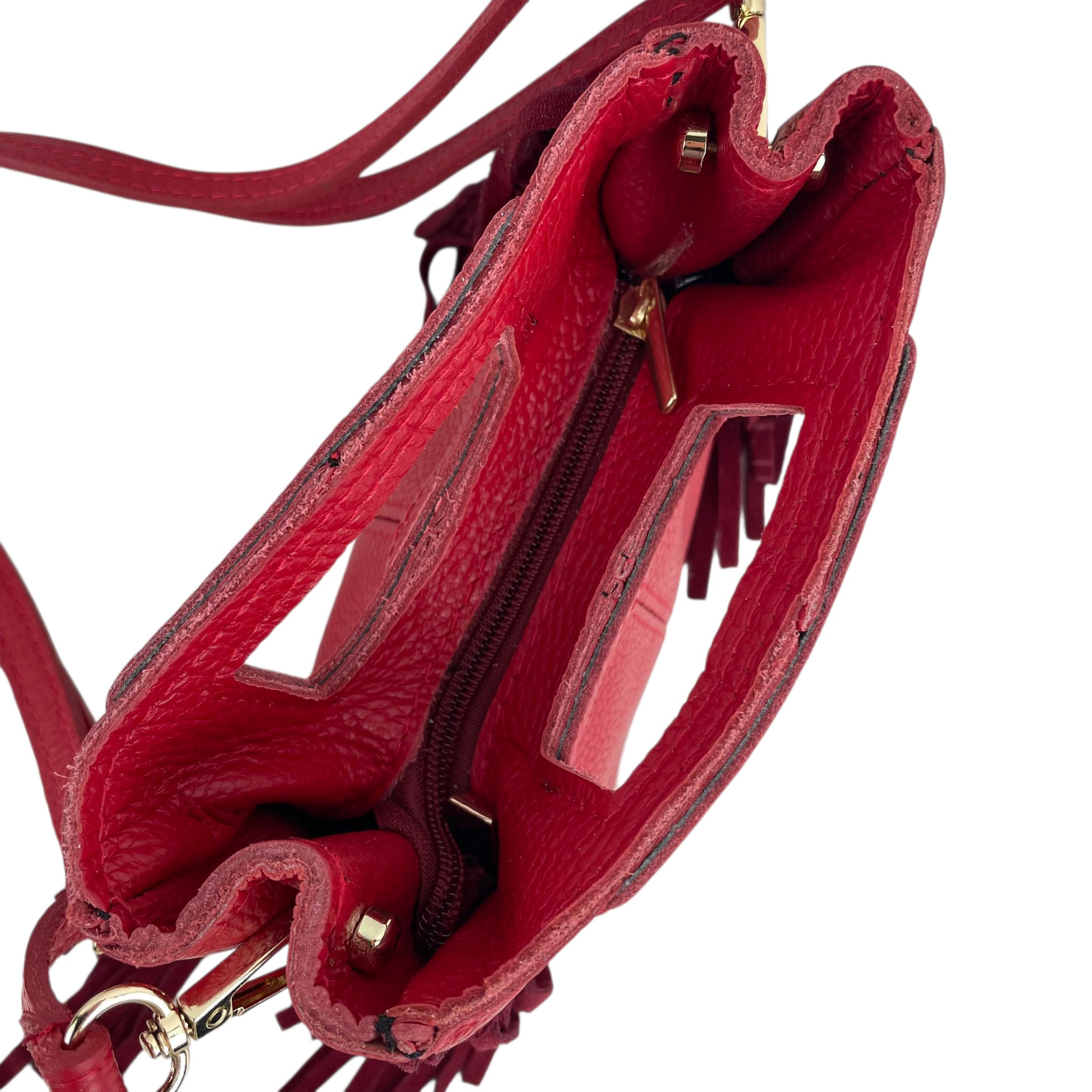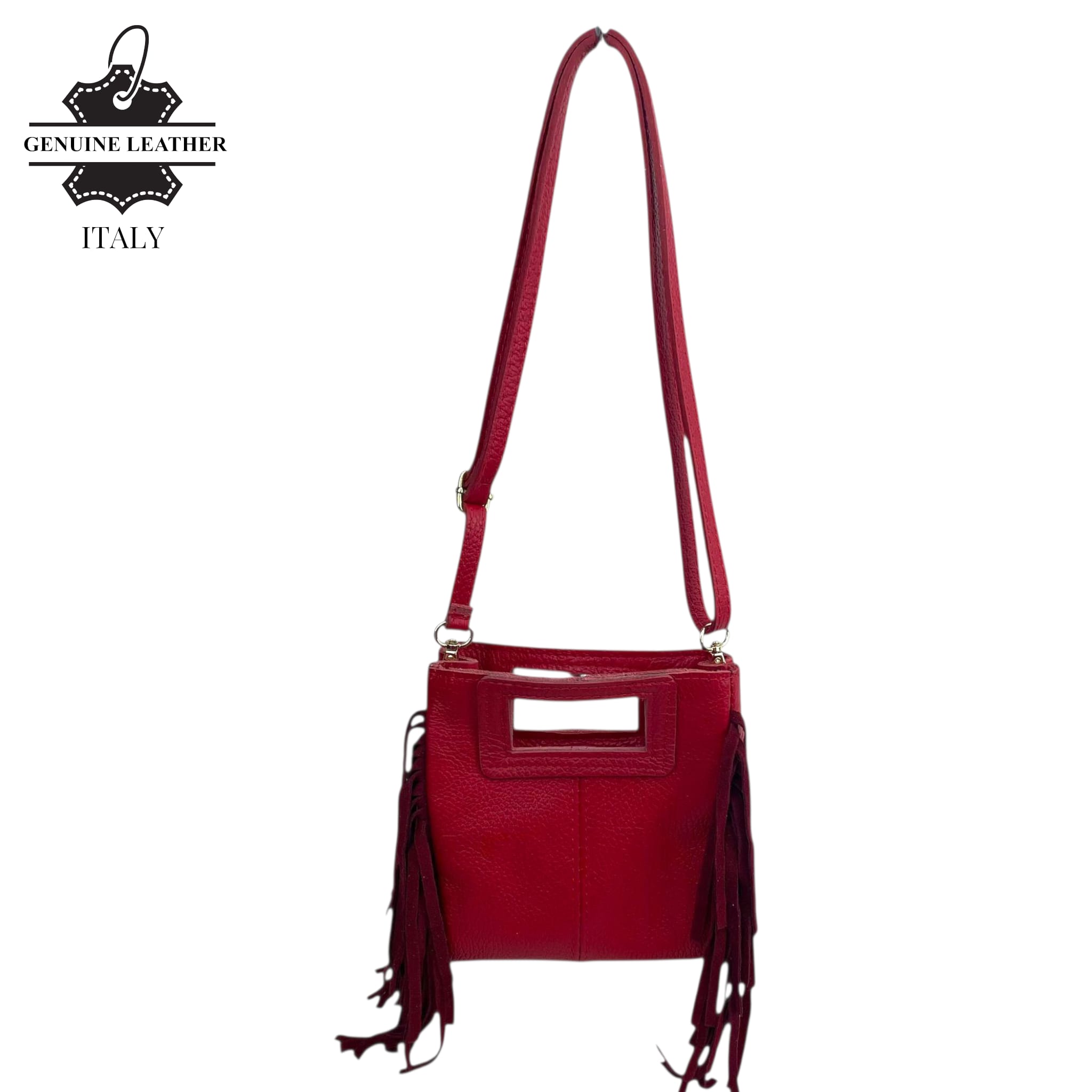 Bolso de Mano Compacto en Piel Italiana con Flecos Decorativos, Gran Calidad y Cremallera para Mujer