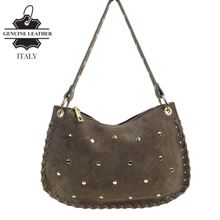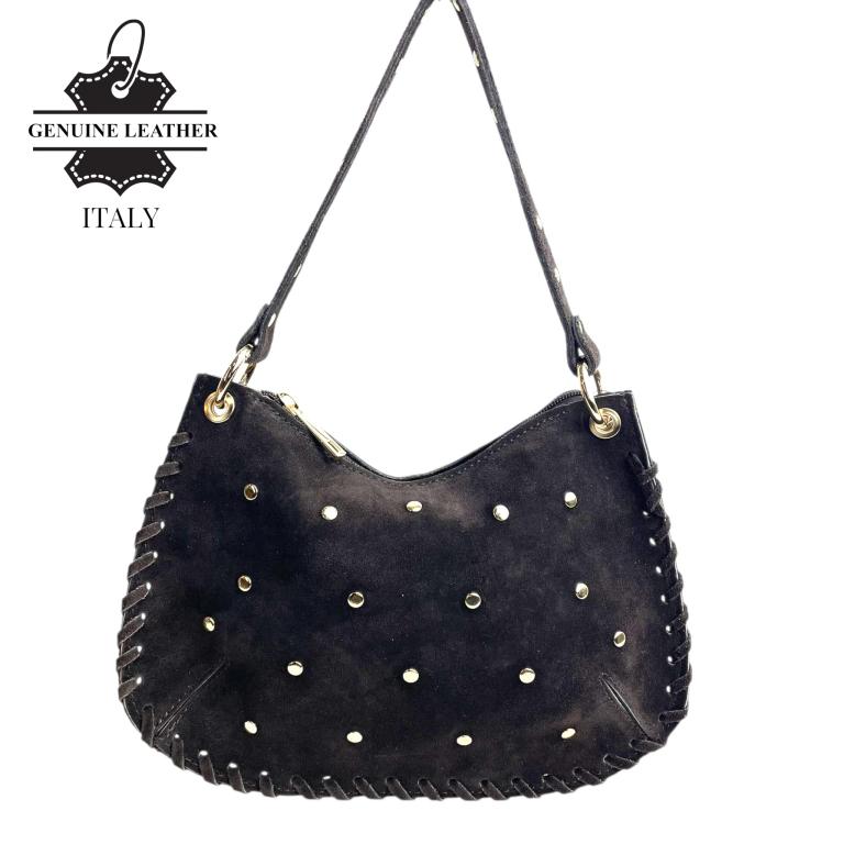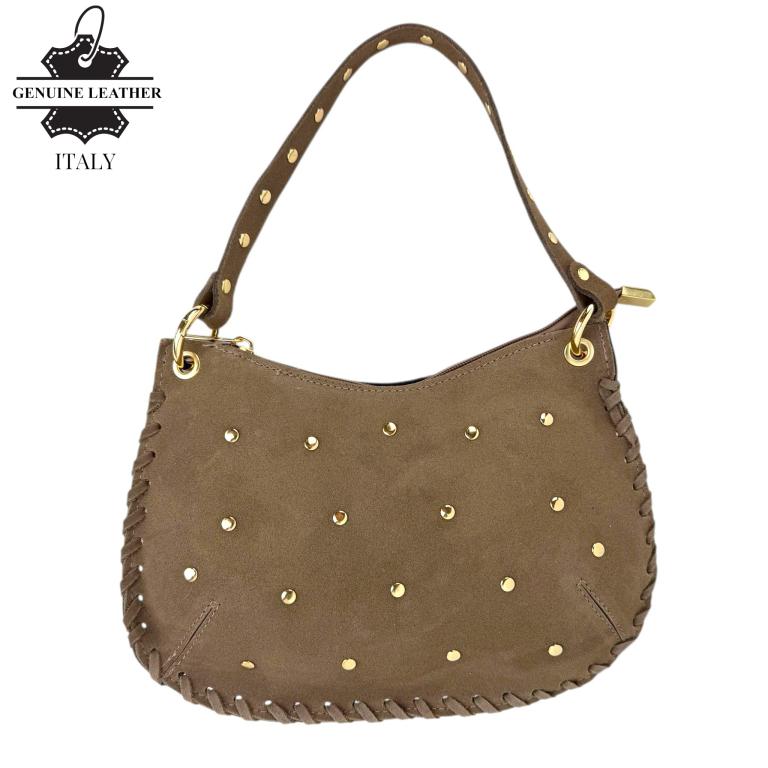 Bolso Piel Serraje semireronda con Tachuelas y en el Asa Corta para Mujer. Fabricado en Italia