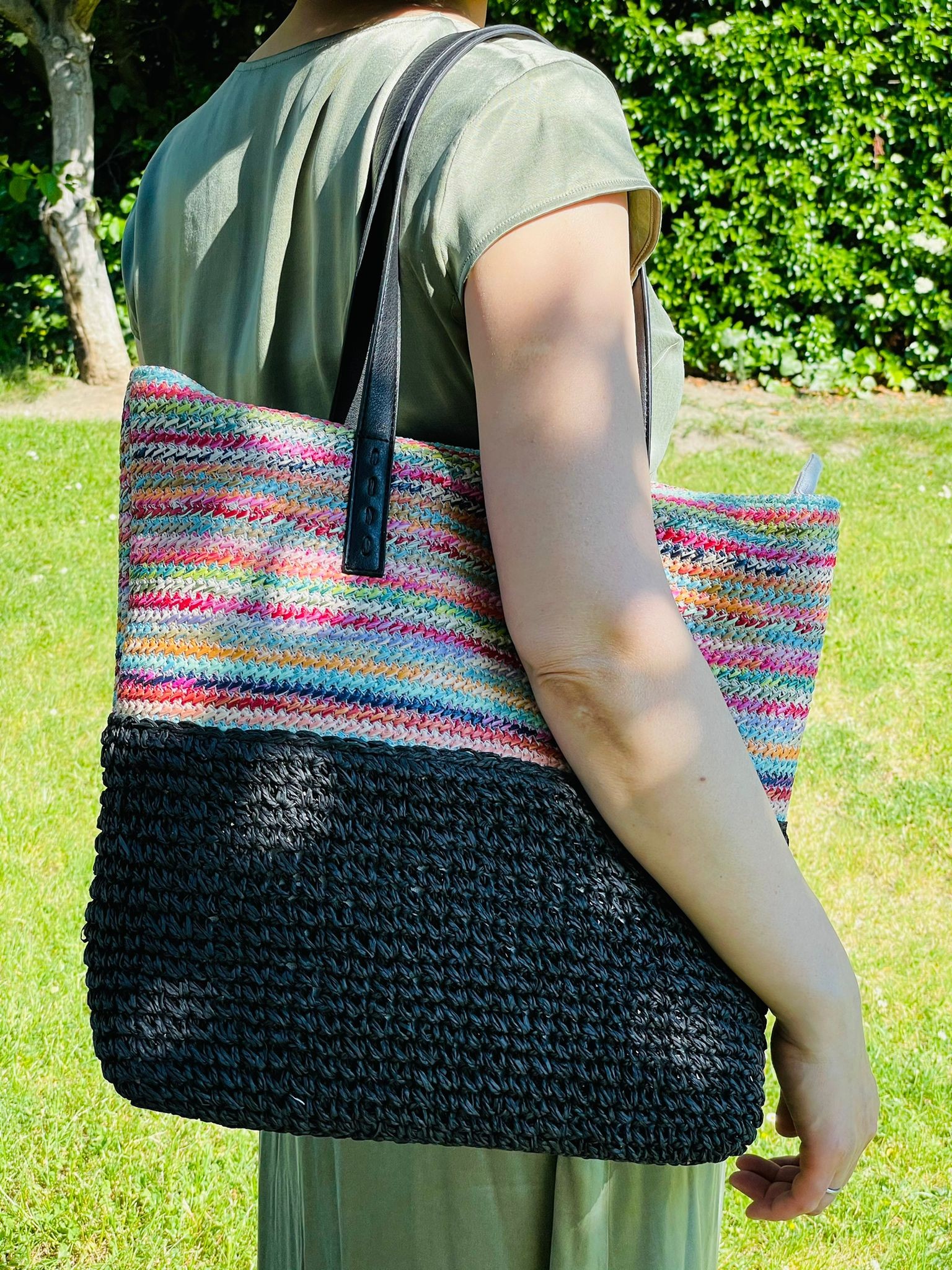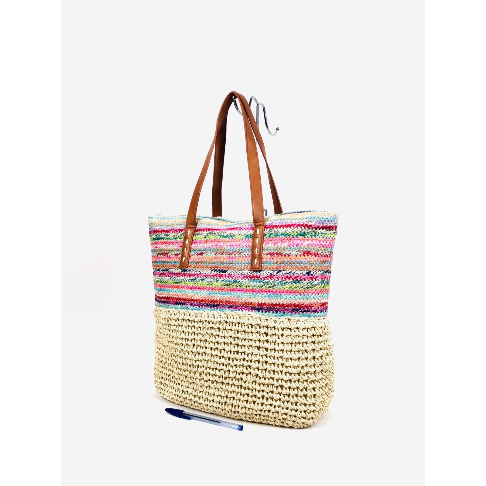 Bolso de Rafia Multicolor con Asas Sintéticas y Cremalleras para Mujer. Ideal para playa y piscina.