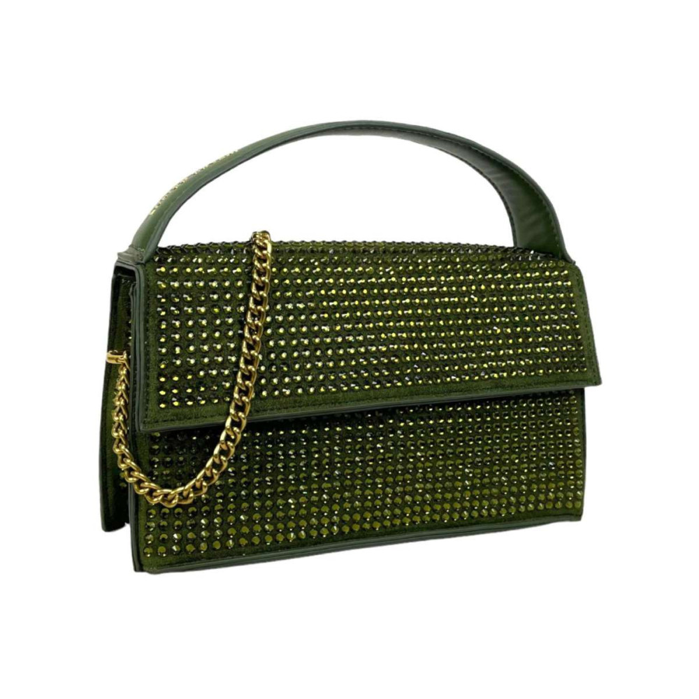 Bolso de Fiesta Mujer con Efecto Brillante y Precioso Diseño. Viene con una tira bandolera tipo cadena dorada, un asa corta de mano y bolsillos interiores.