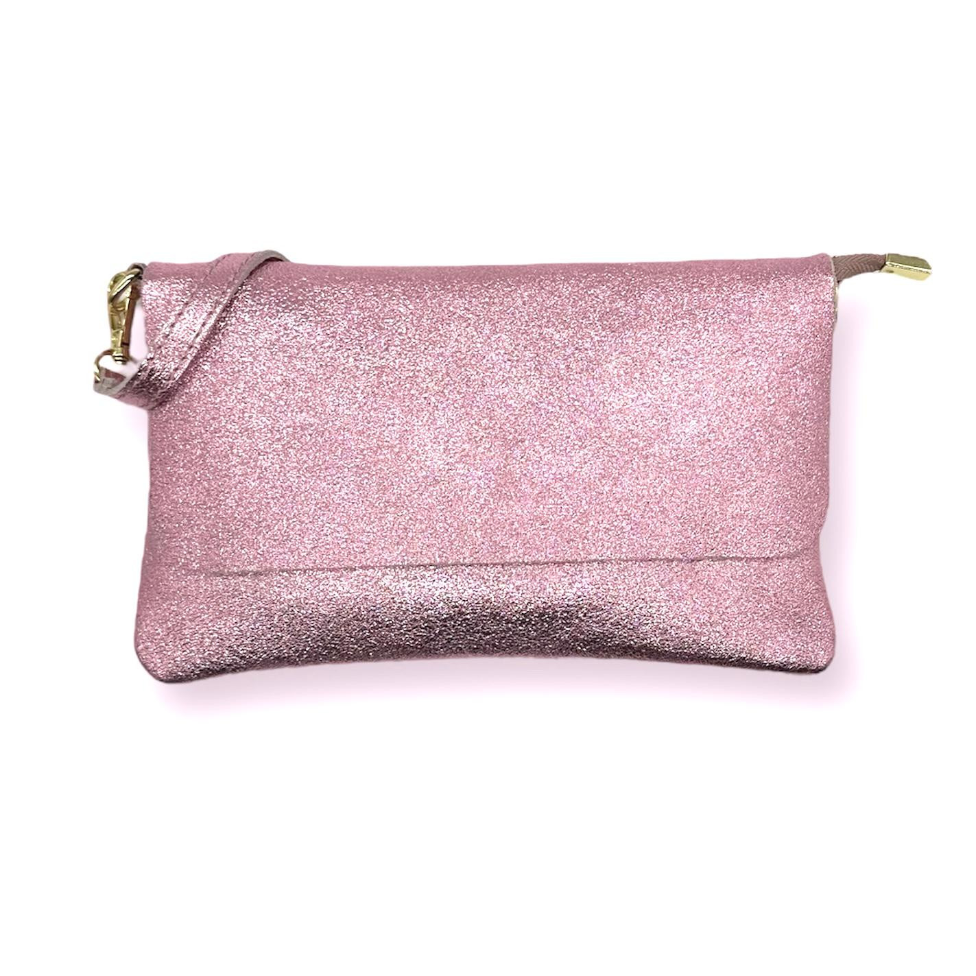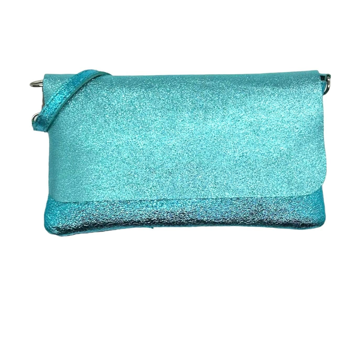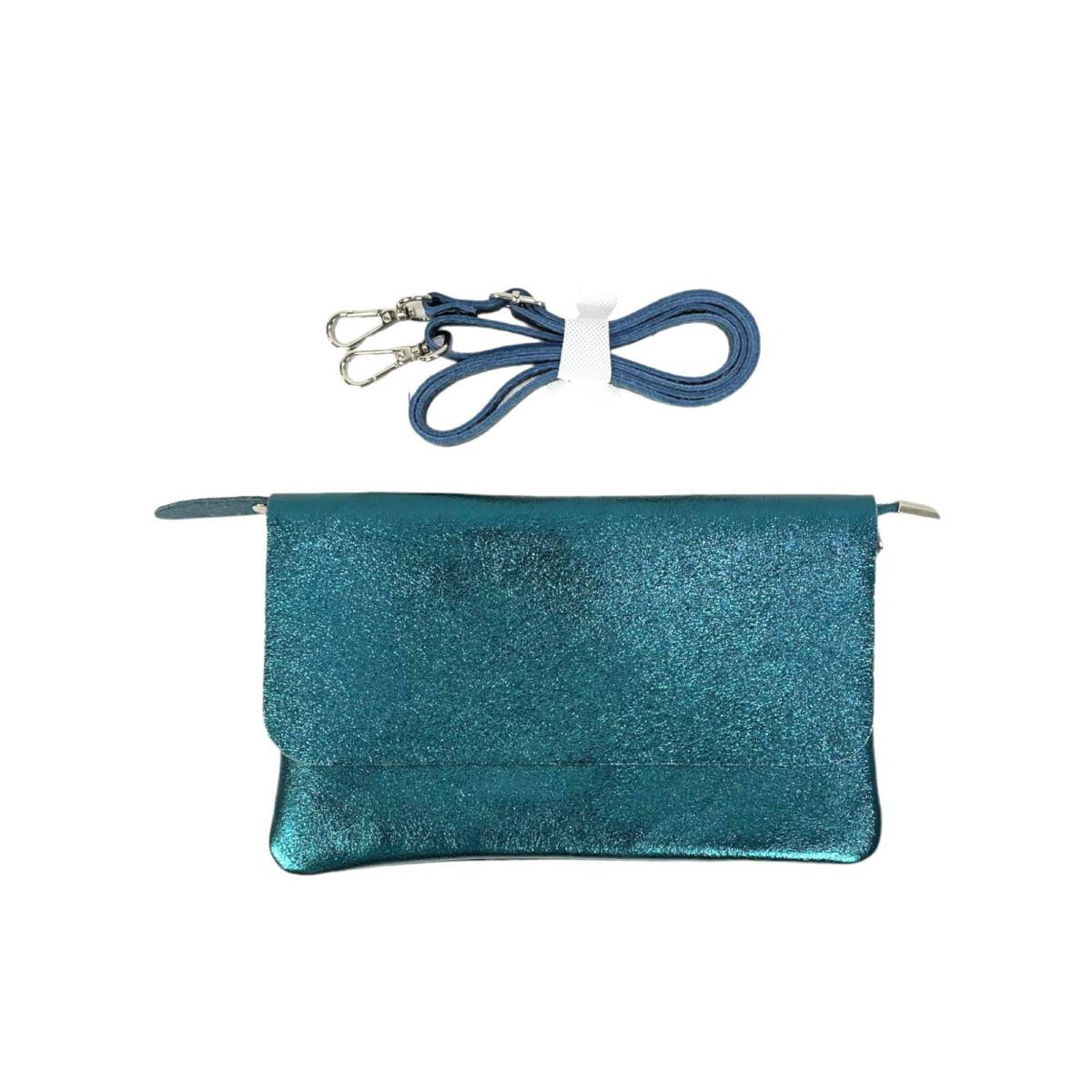 Bolso de Piel metalizado estilo sobre con tira bandolera, solapa y cremallera. Fabricado en Italia.