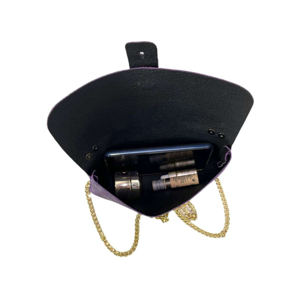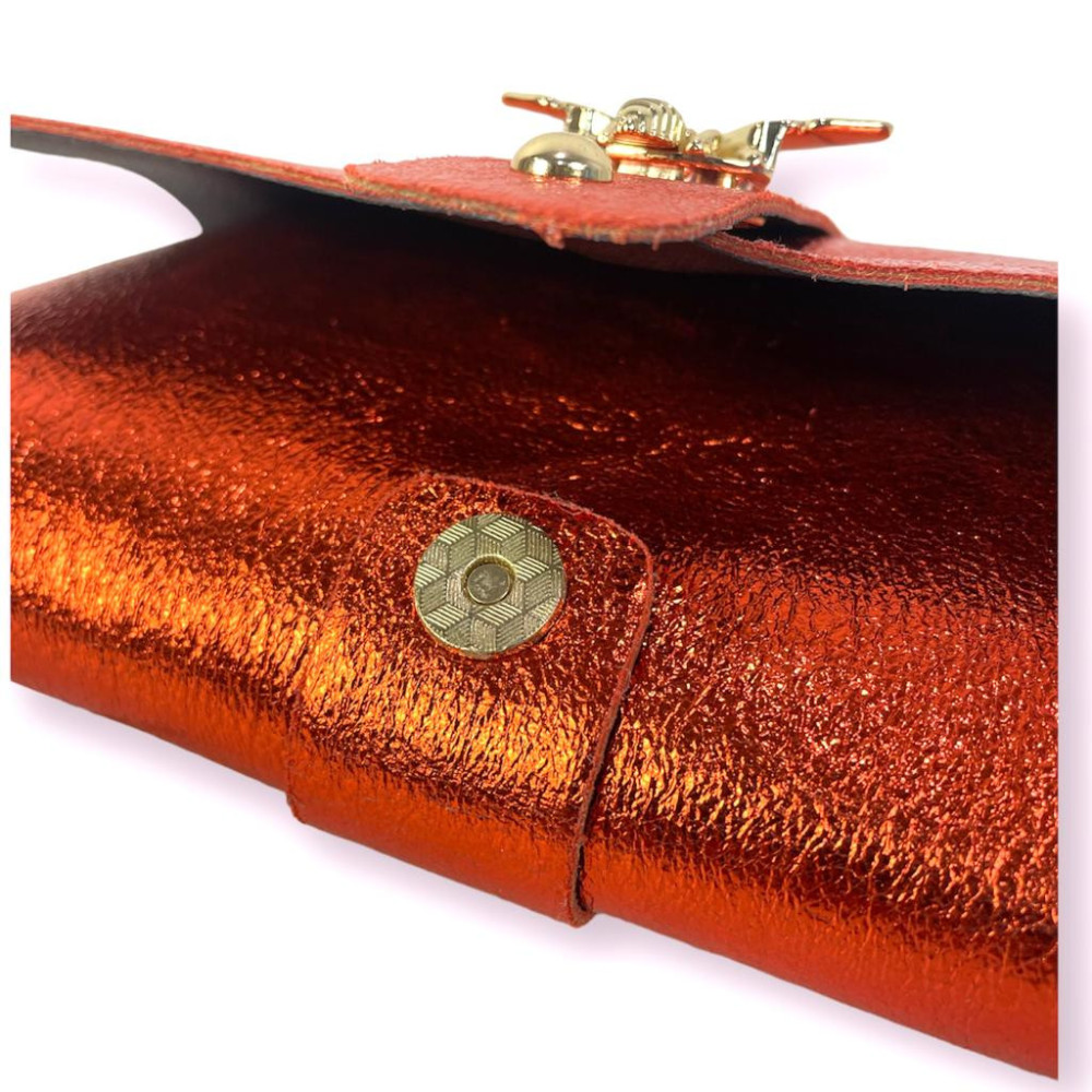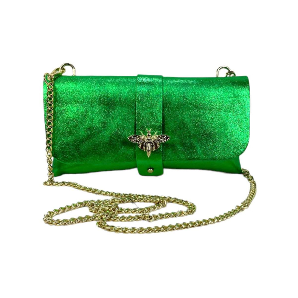 Bolso de Piel metalizado tipo sobre con asa larga estilo cadena, solapa de botón y broche de abeja, ideal para cualquier mujer. Fabricado en Italia.