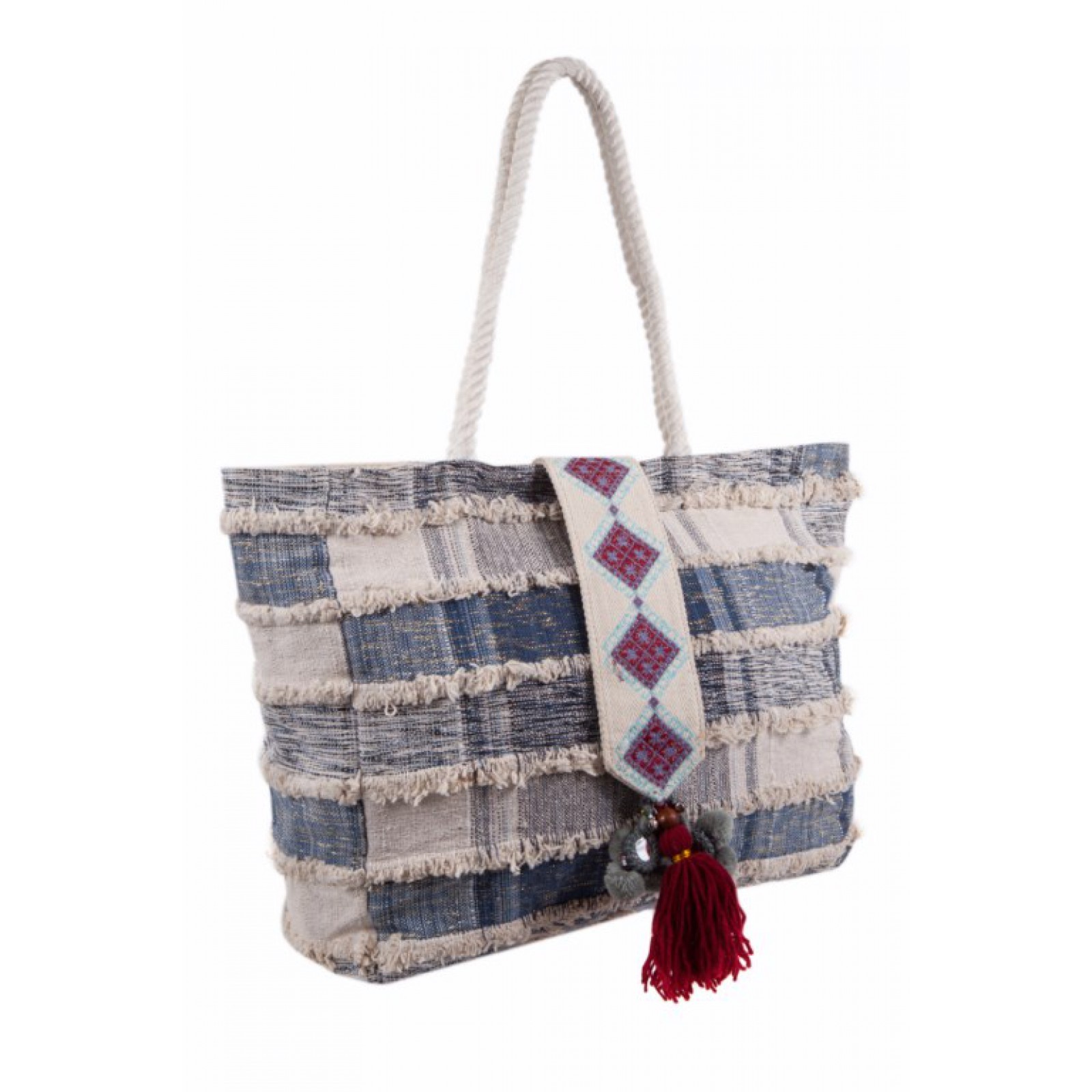 Bolso Shopper artesanal de Lona y Algodón con 2 asas de mano, gran capacidad y solapa magnética con flecos decorativos. El forro interior es de color Fucsia, haciéndolo más original y exclusivo.