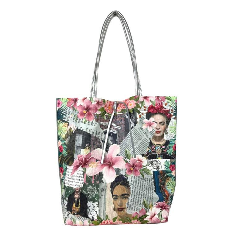 Amplio Bolso Shopper de Mujer en Piel con Diseño Frida Kahlo Frontal, Parte Trasera Brillante y Monedero Extra con Cierre de Cremallera. Fabricado en Italia.