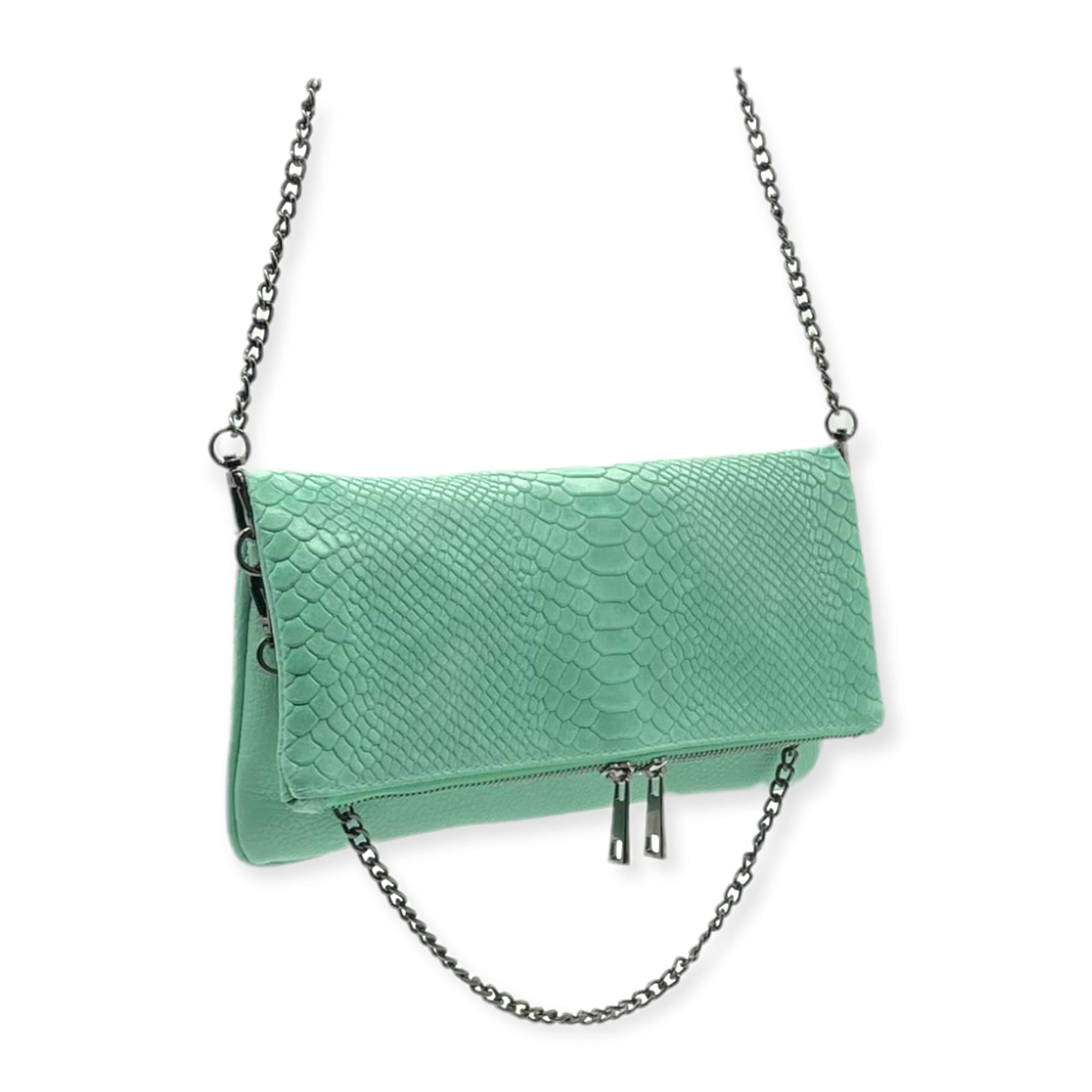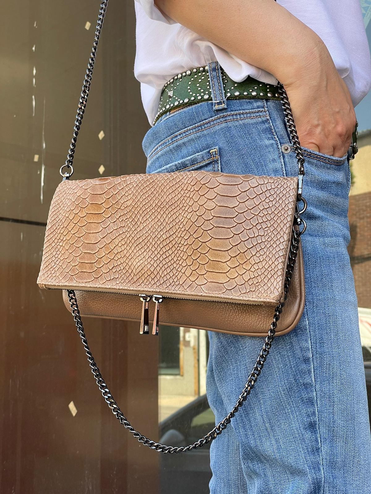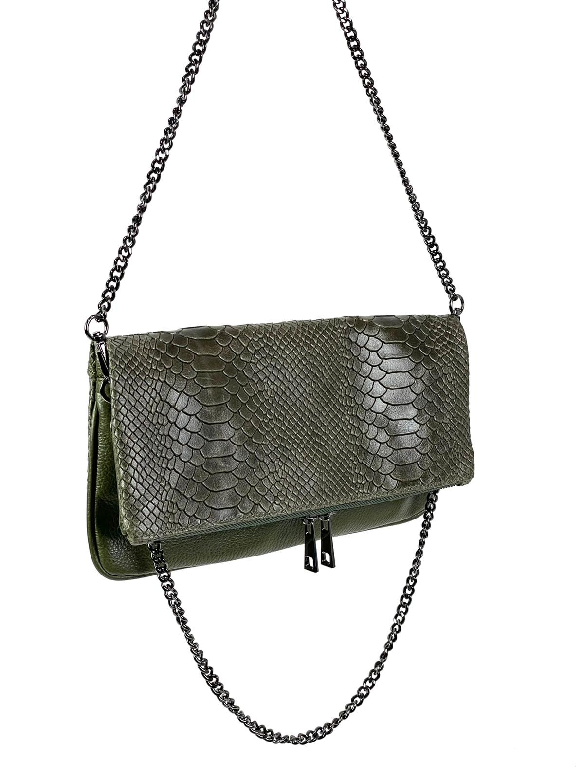 Bolso de piel natural con efecto serpiente con cierre por cremallera y asa hecha con cadena metálica.