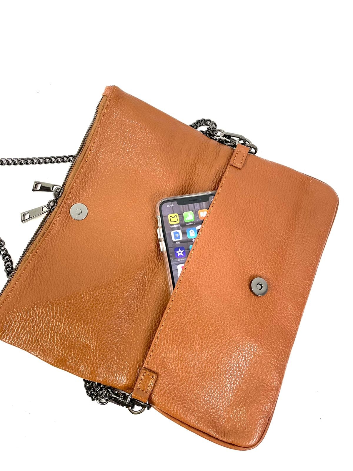 Más Sorpresas: Asa larga de cadena, compartimento exterior bajo la solapa, bolsillo trasero con cremallera