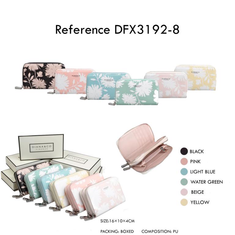 Cartera de Mujer en Piel Sintética con Caja, Diseño Flores y 2 Bolsillos con Cierre de Cremallera. Colección Diana & Co Firenze.