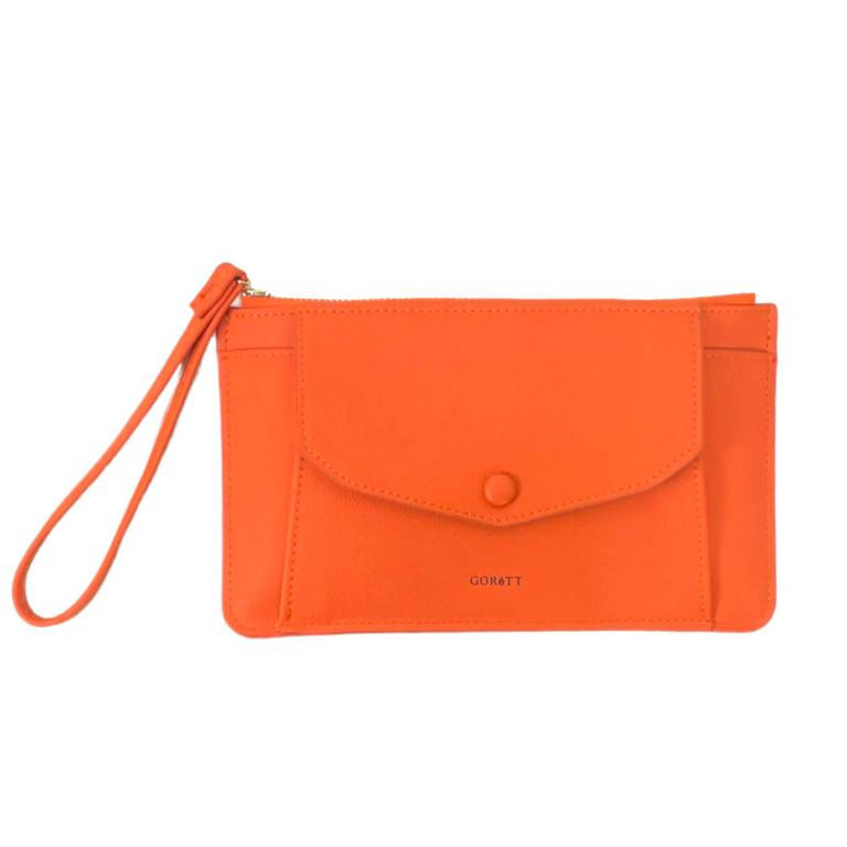 Cartera plana de mano con asa corta de polipiel para llevar en la muñeca.