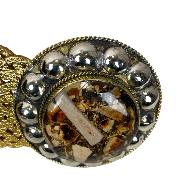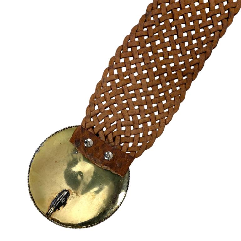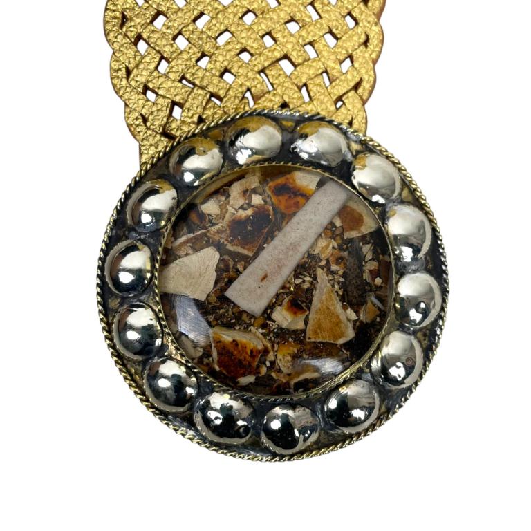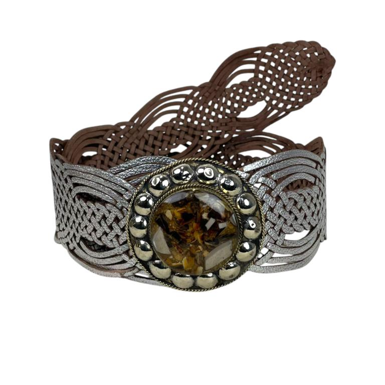 Cinturón Artesanal Metalizado en Piel con Hebilla Circular y Estilo Único para Mujer.