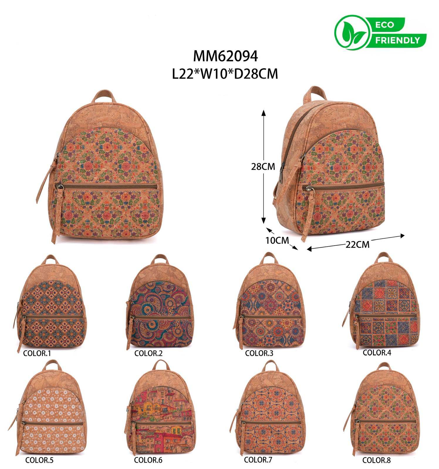Mochila Ecológica de Corcho Sintético para Mujer con 2 Bolsillos Frontales con Cierre de Cremallera y Alegre Diseño.