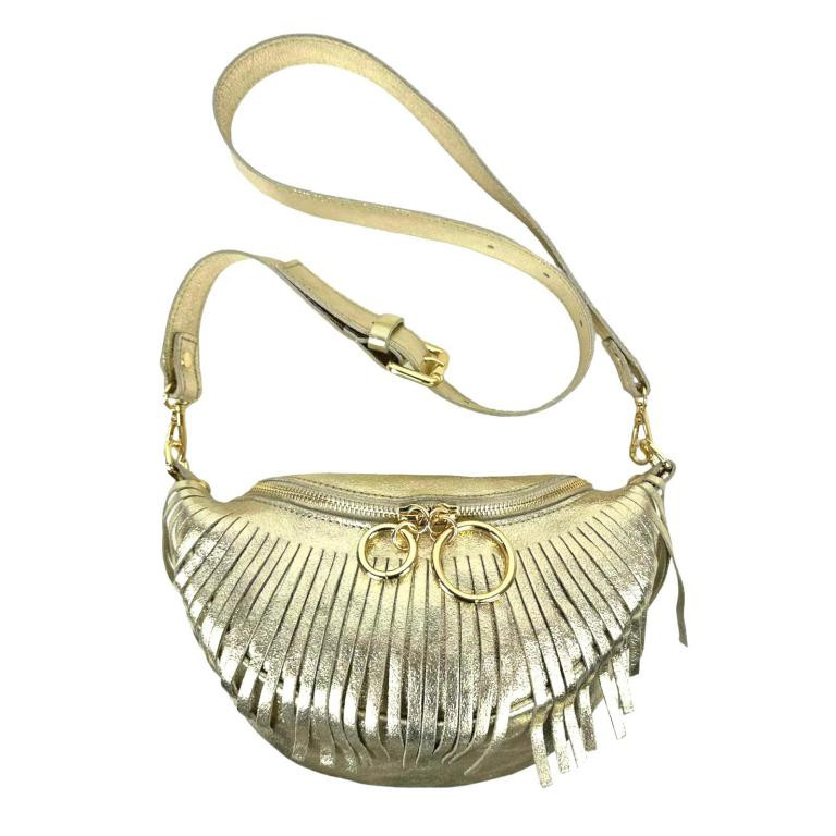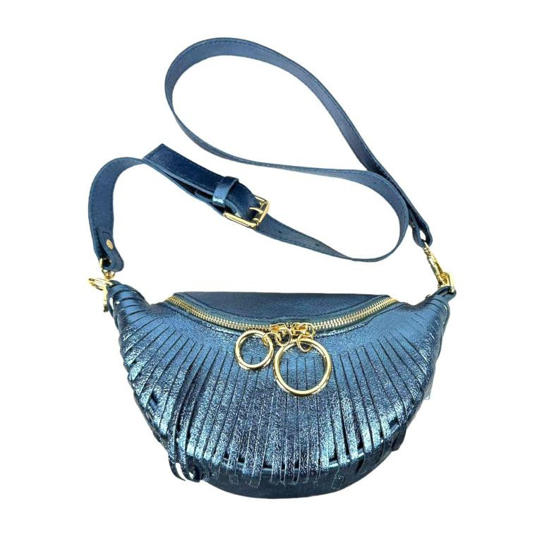 Riñonera de Piel Italiana para Mujer con Efecto Brillante y Flecos Decorativos