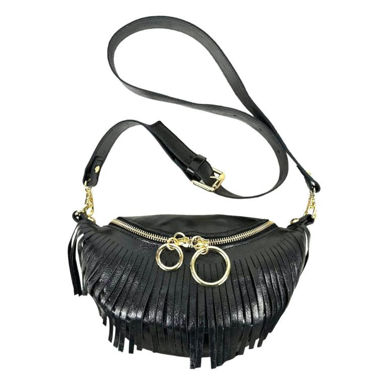 Riñonera de Piel Italiana para Mujer con Efecto Brillante y Flecos Decorativos.