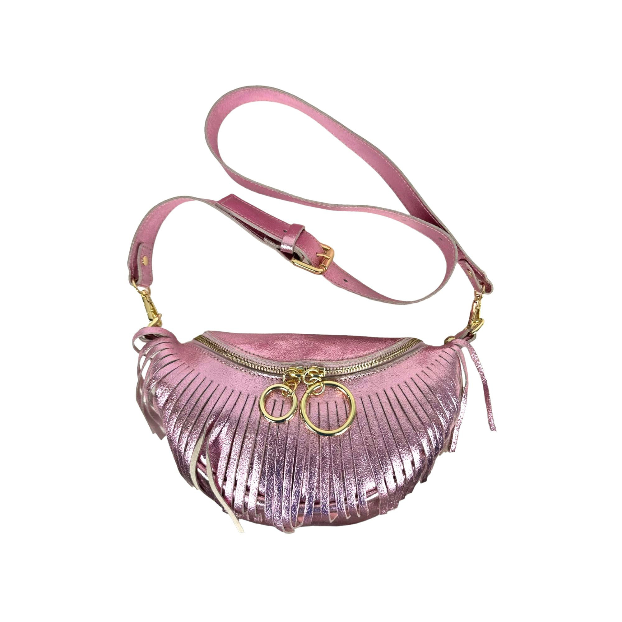 Riñonera de Piel Italiana para Mujer con Efecto Brillante, Cierre de Cremallera, Compartimento Interior y Flecos Decorativos. Fabricado en Italia.