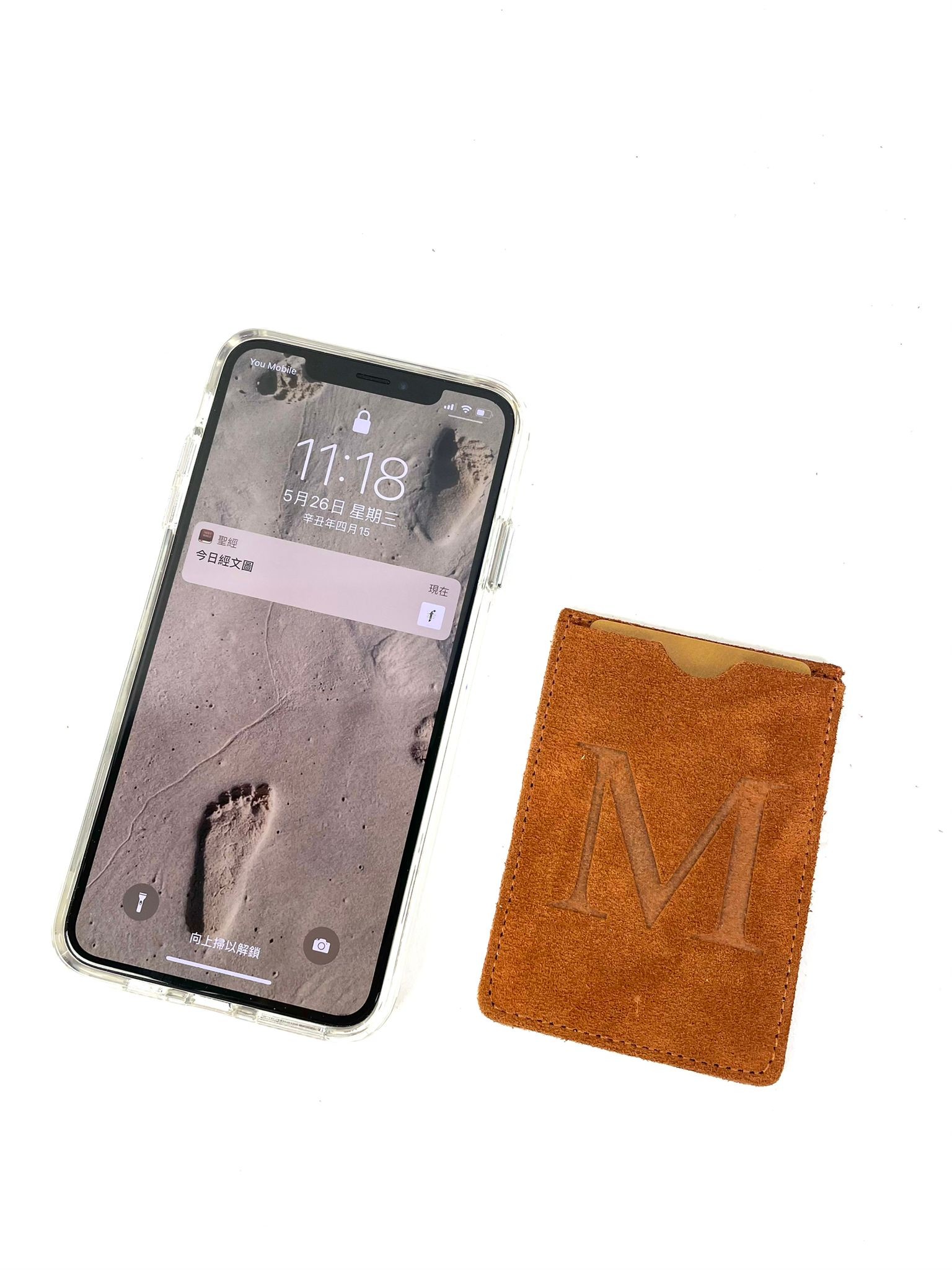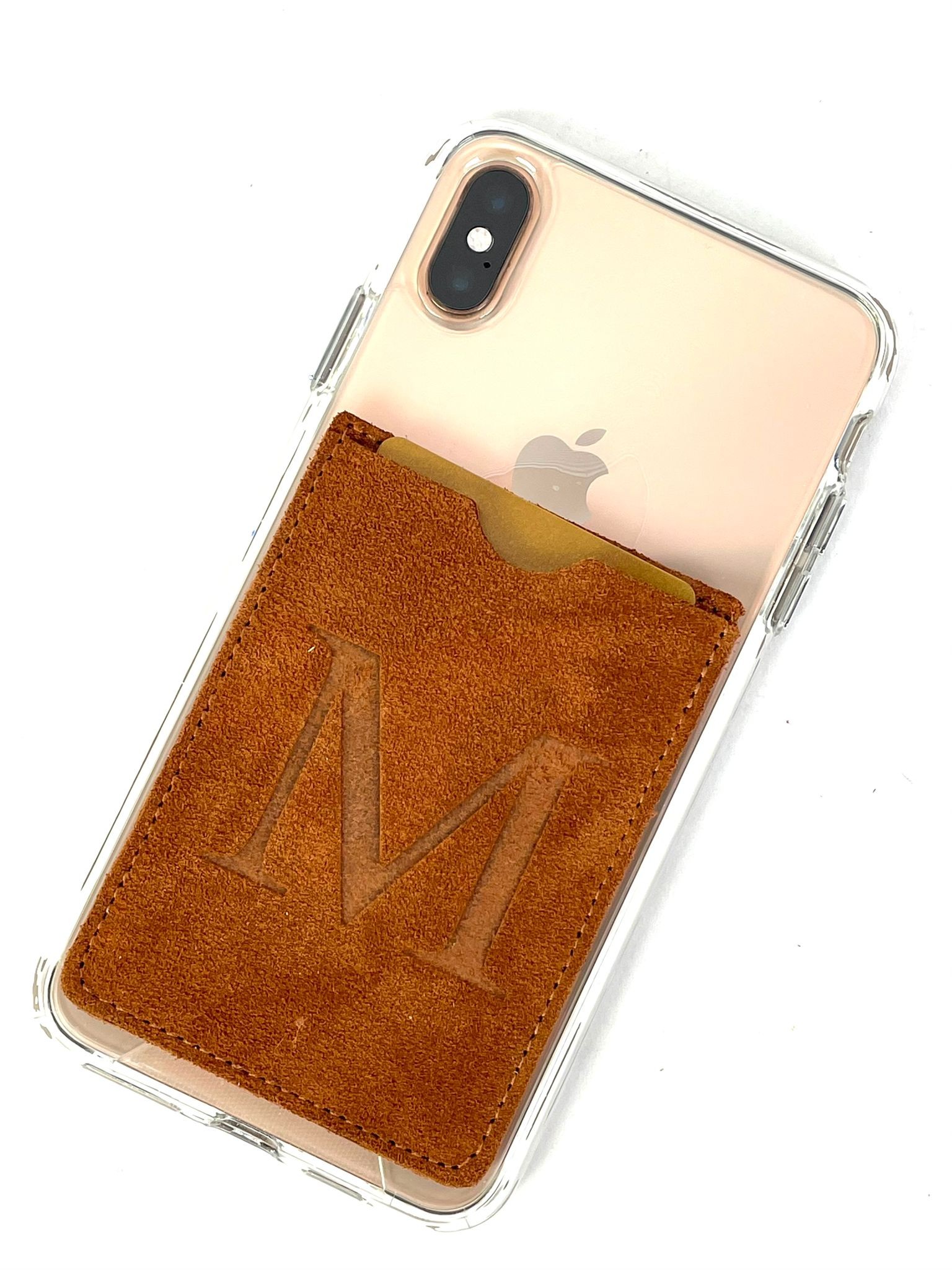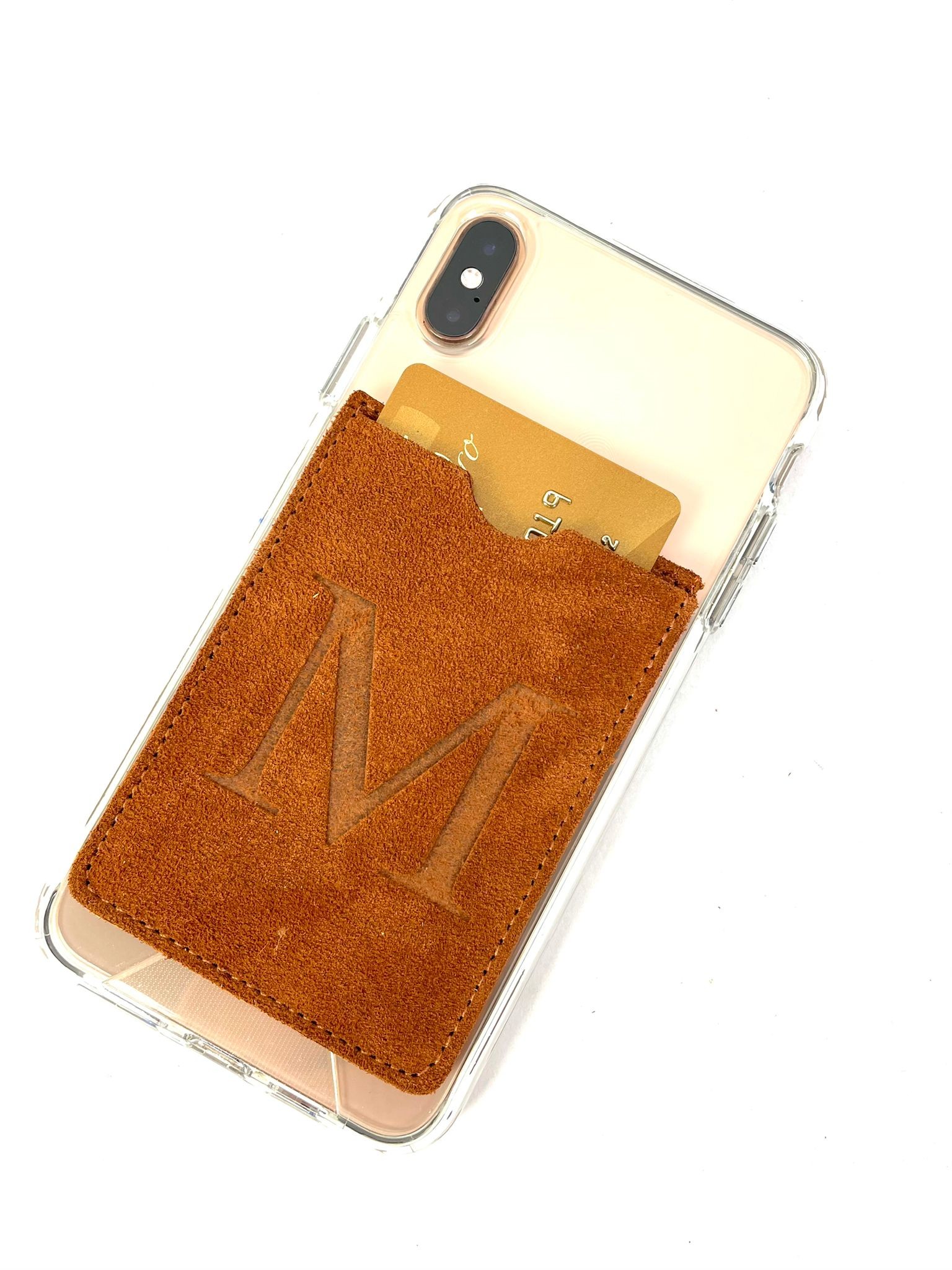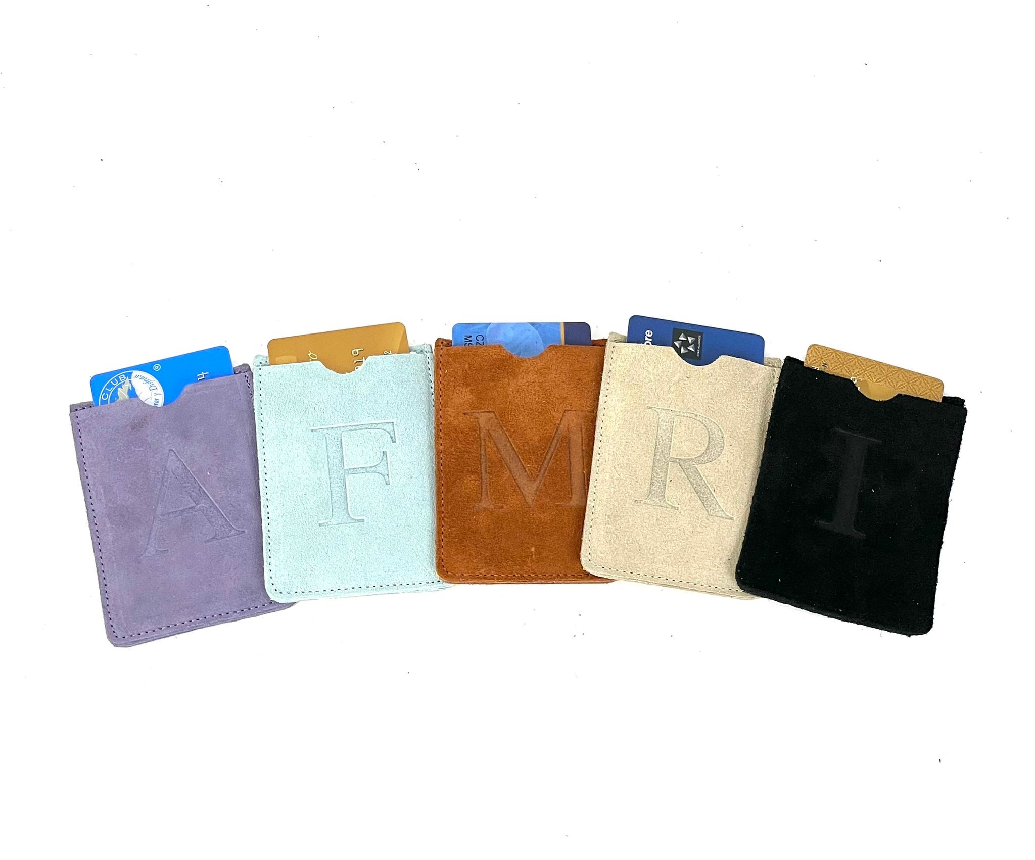 Tarjetero de cuero natural serraje con letra inicial. Este tarjetero tiene un adhesivo en la parte trasera para pegarlo donde tu quieras, sobre todo detrás del teléfono móvil.