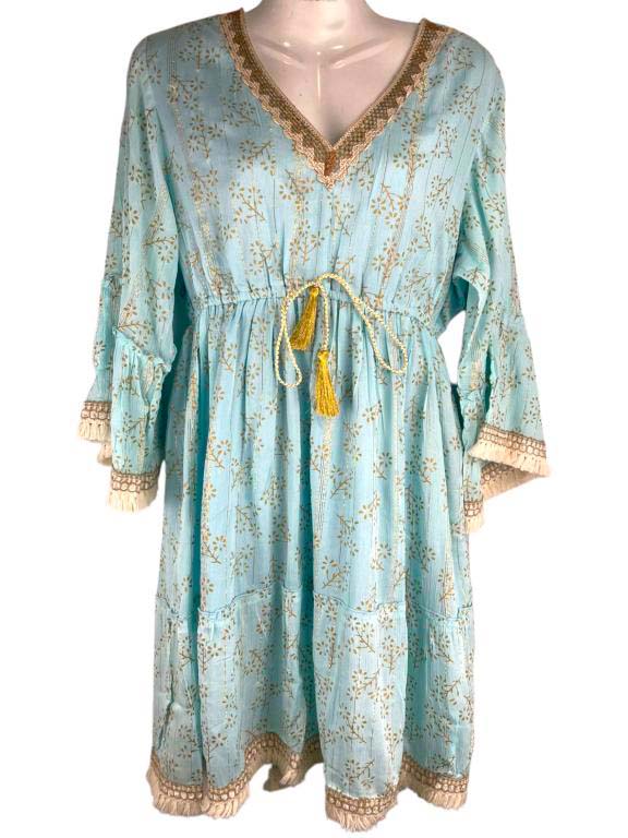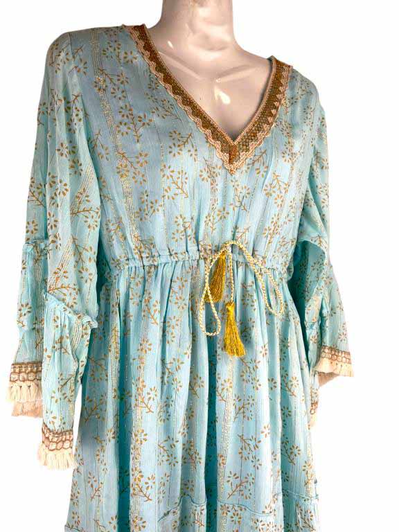 Vestido Artesanal Estilo Boho Chic con Manga Larga, Gran Calidad y Cordones Frontales para Mujer. Fabricado en India.